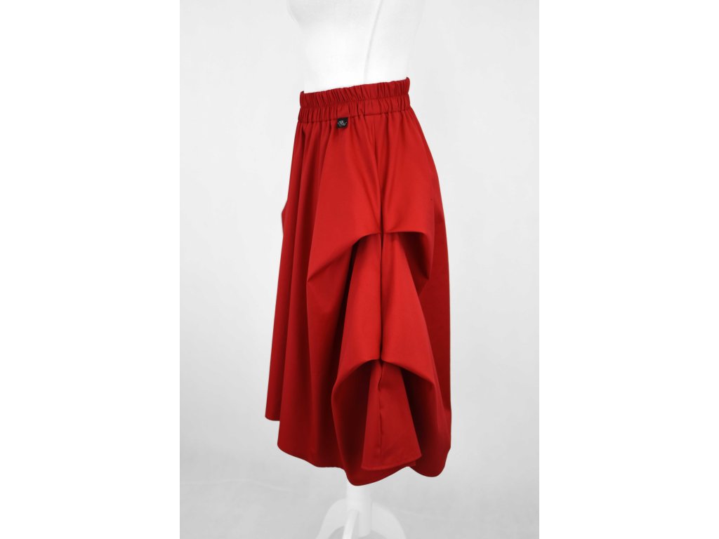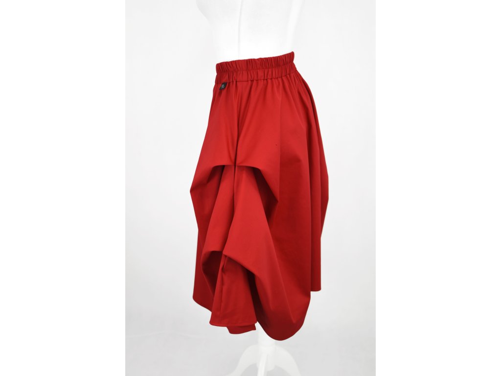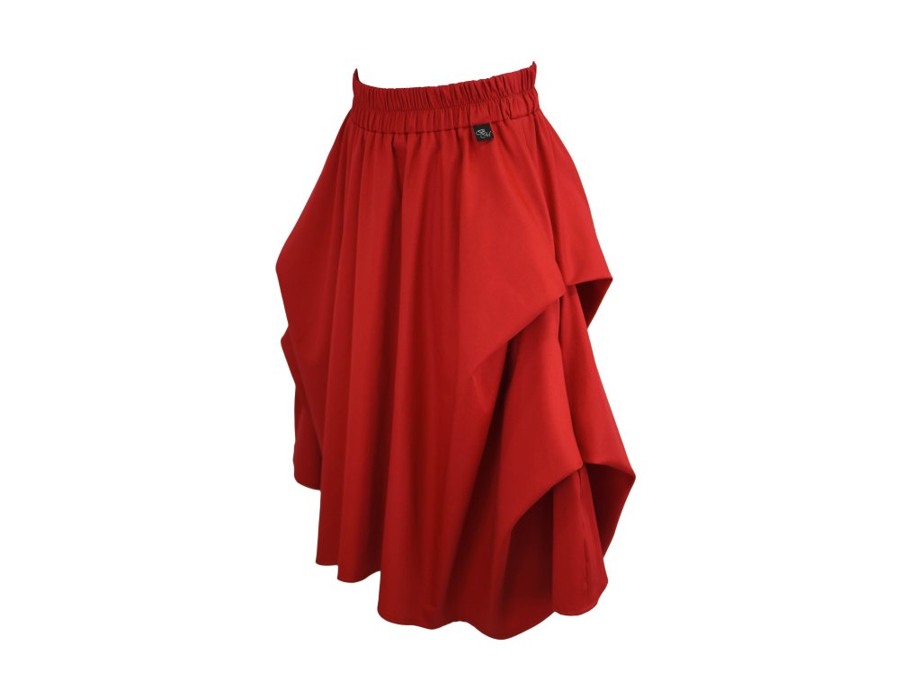 Dámská sukně půlkolového střihu se symetrickými sklady na obou bocích. Ty tvoří tři cípy a dělají na sukni zajímavý prvek s bohatým objemem. V pase má skrytou prošitou gumu, v bocích jsou dvě skryté kapsy. Délka je lehce asymetrická, zadní díl je o 5 cm delší.