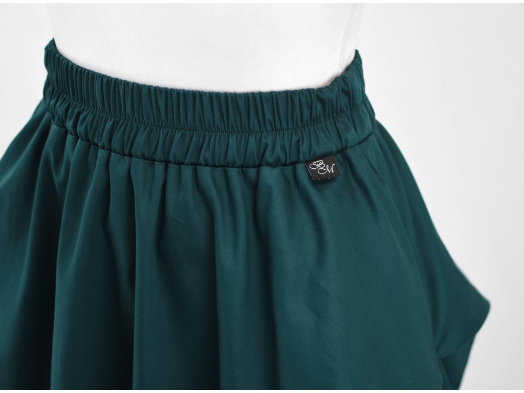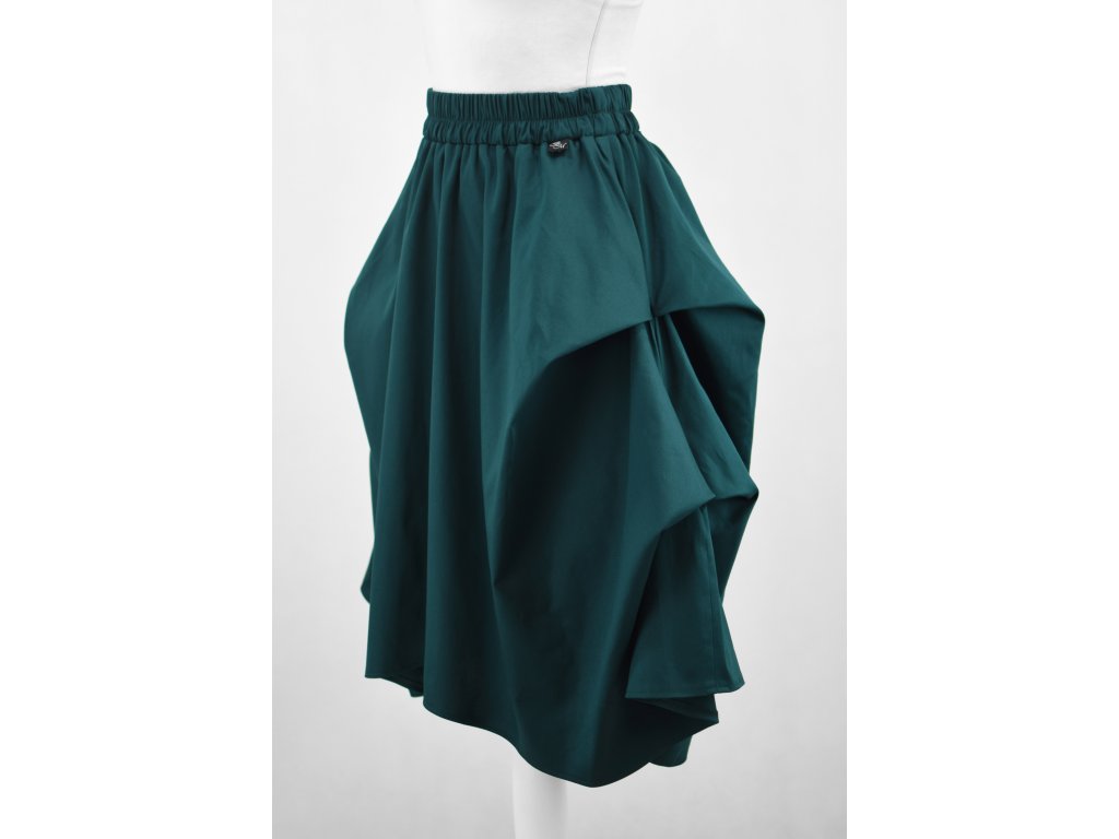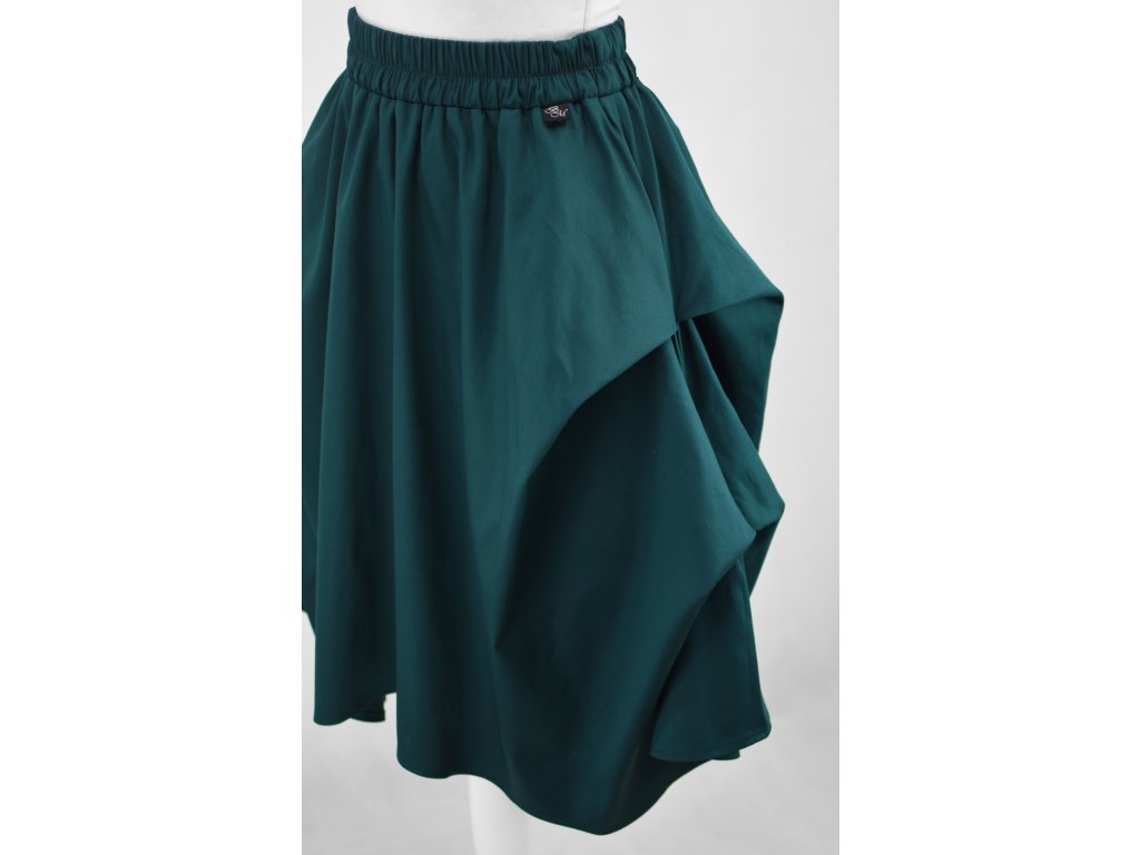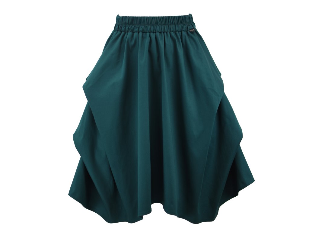 Dámská sukně půlkolového střihu se symetrickými sklady na obou bocích. Ty tvoří tři cípy a dělají na sukni zajímavý prvek s bohatým objemem. V pase má skrytou prošitou gumu, v bocích jsou dvě skryté kapsy. Podšité polyesterovou látkou, která je vhodná jak na punčochy, tak na holé nohy a sukně se dá nosit celoročně. Délka je lehce asymetrická, zadní díl je o 5 cm delší.