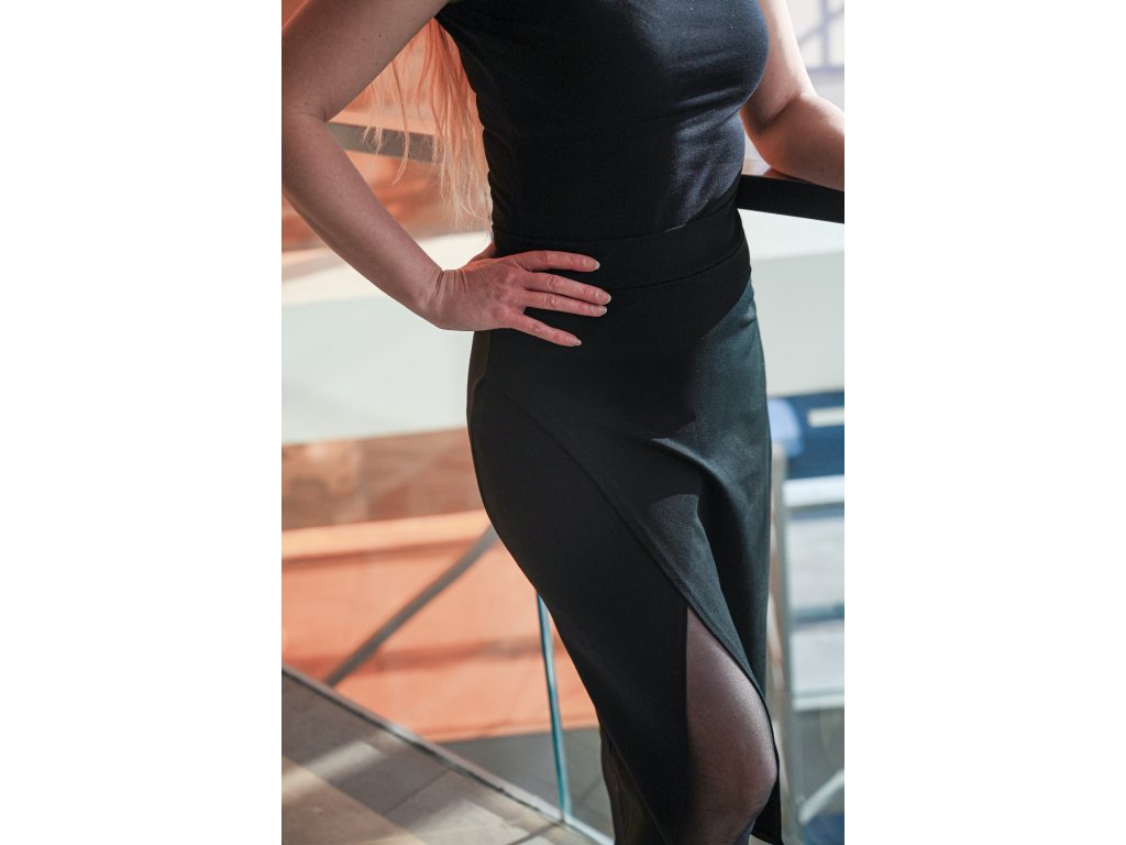 Dámská sukně pouzdrového střihu s rafinovaným rozparkem na pravé straně. Pas je tvořen zdvojeným materiálem jako sukně. Sukně je na tělo a obepne hýždě a nohy. Nemá podšívku, dá se i tak nosit na punčochy i holé nohy.