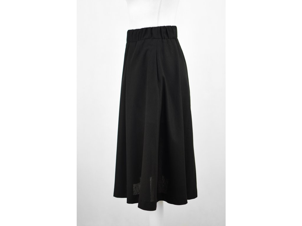 Dámská sukně áčkového střihu s knoflíkovou légou (ta je pouze dekorační, nedá se rozepnout). Přední díl má dva sklady, které sukni tvarují. V pase je na gumu,  z rubu pasu je skrytý otvor, kterým se dá vyměnit. V bocích nesmí chybět dvě skryté kapsy.