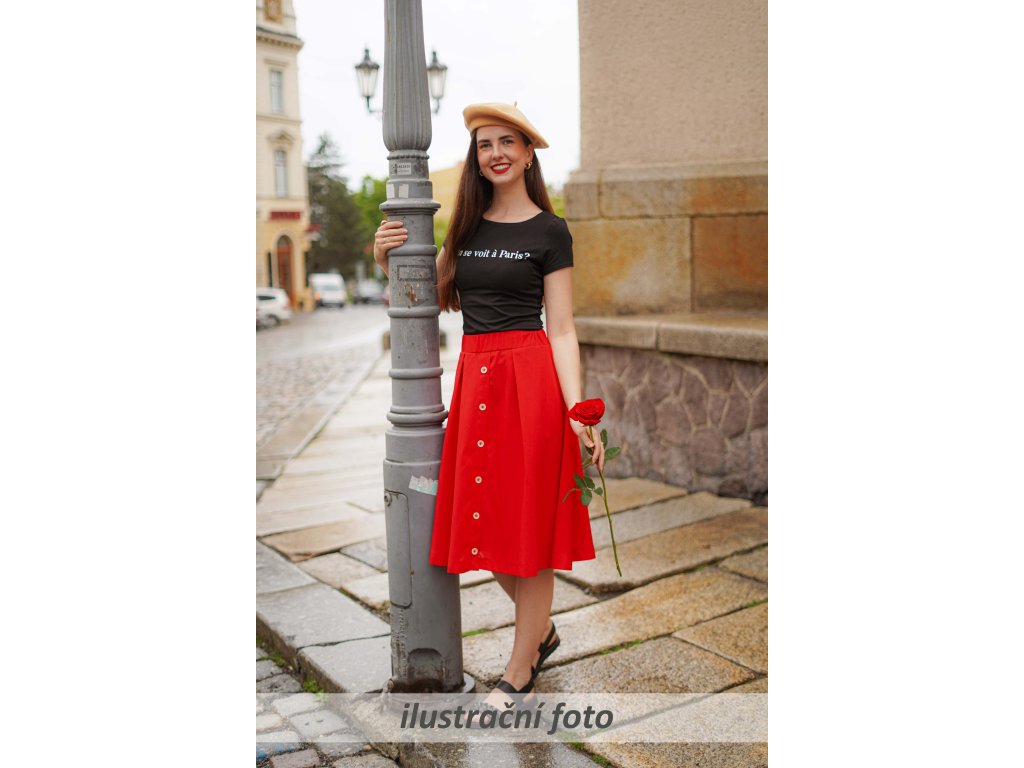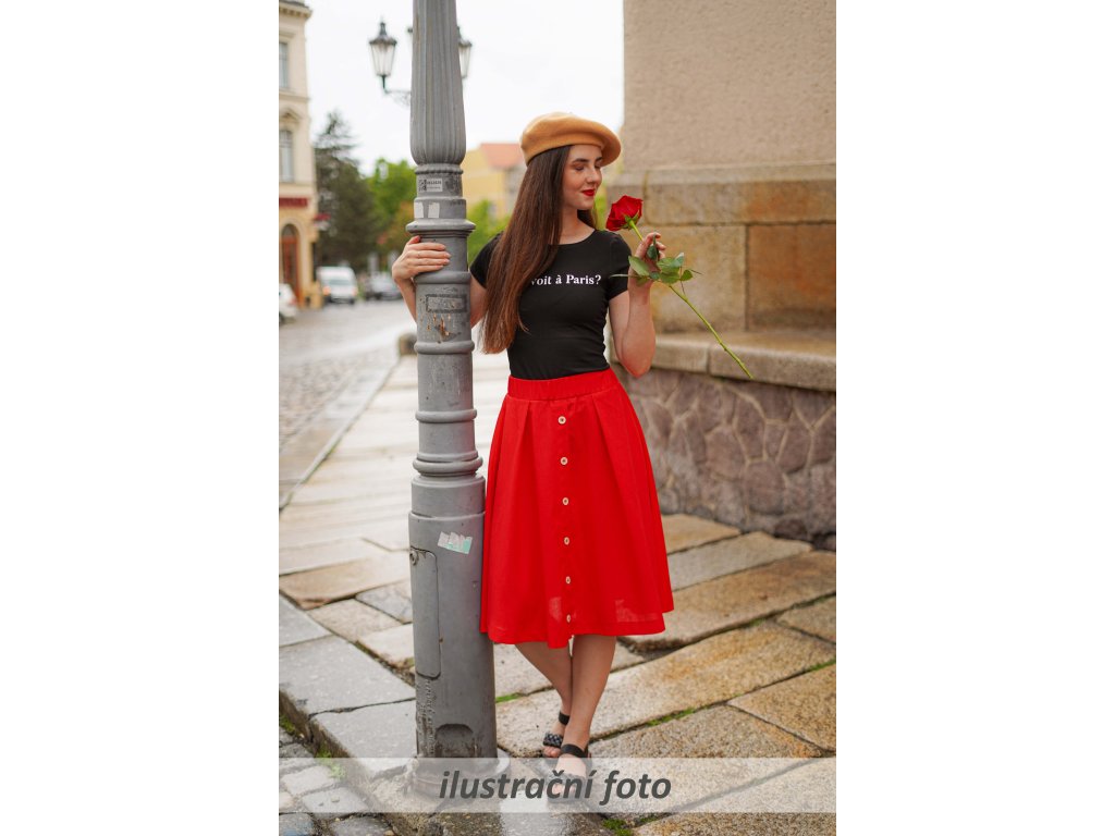 Dámská sukně áčkového střihu s knoflíkovou légou (ta je pouze dekorační, nedá se rozepnout). Přední díl má dva sklady, které sukni tvarují. V pase je na gumu, z rubu pasu je skrytý otvor, kterým se dá vyměnit. V bocích nesmí chybět dvě skryté kapsy.