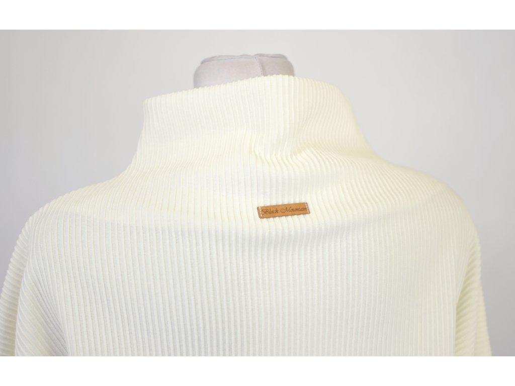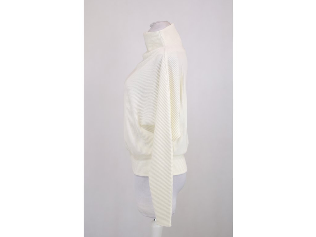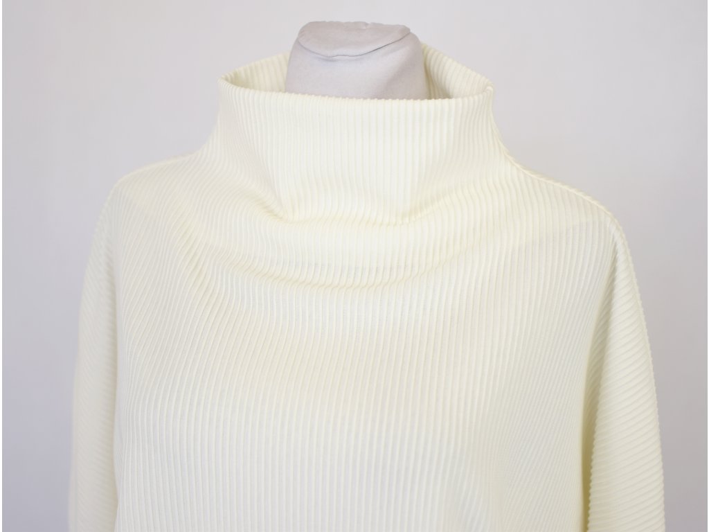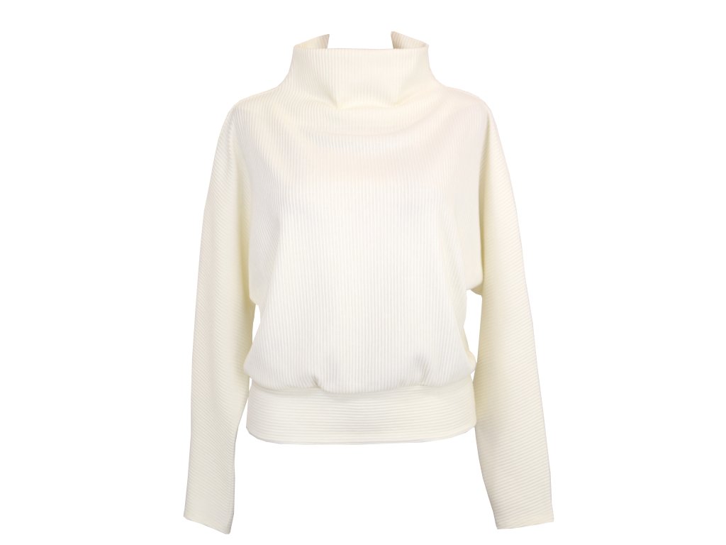 Dámský svetr netopýřího střihu s volnějším dvojitým stojáčkem a dlouhými rukávy. Je s volným hrudníkem a je podkasaný do dvojitého lemu v dolním okraji. Působí volně a ležérně.