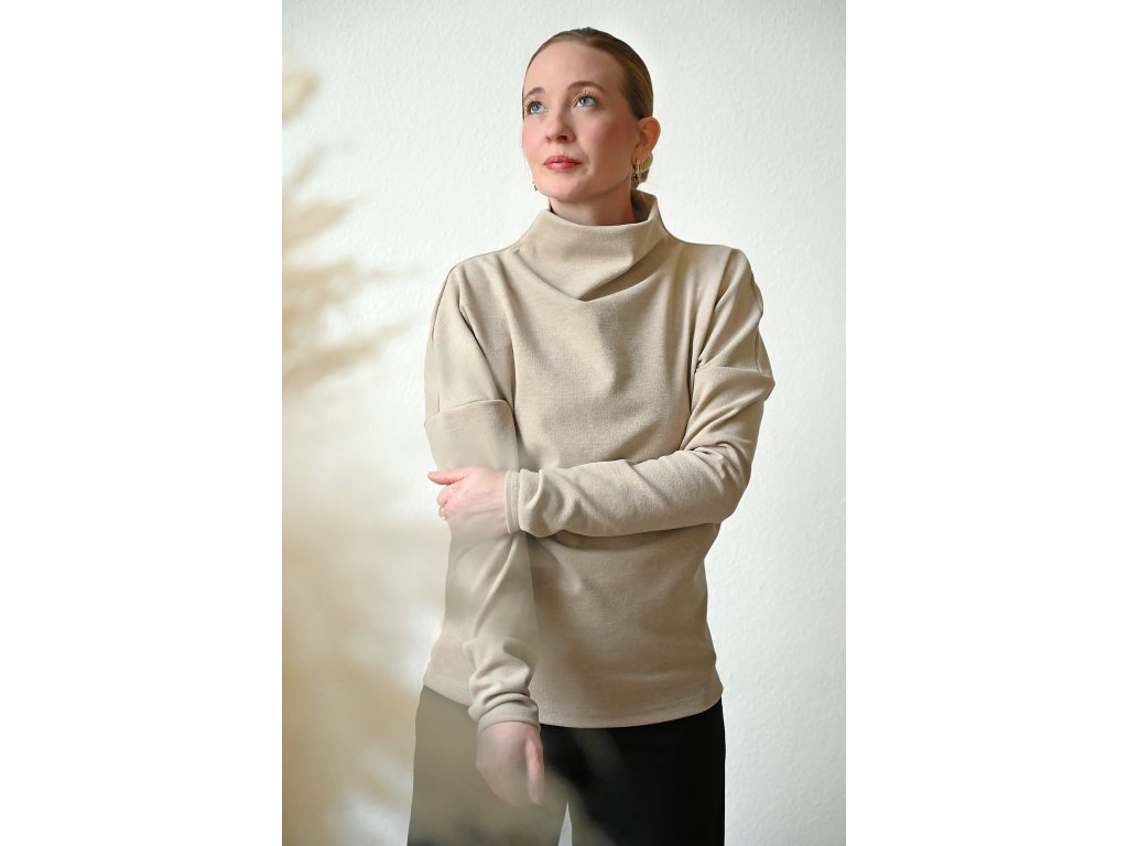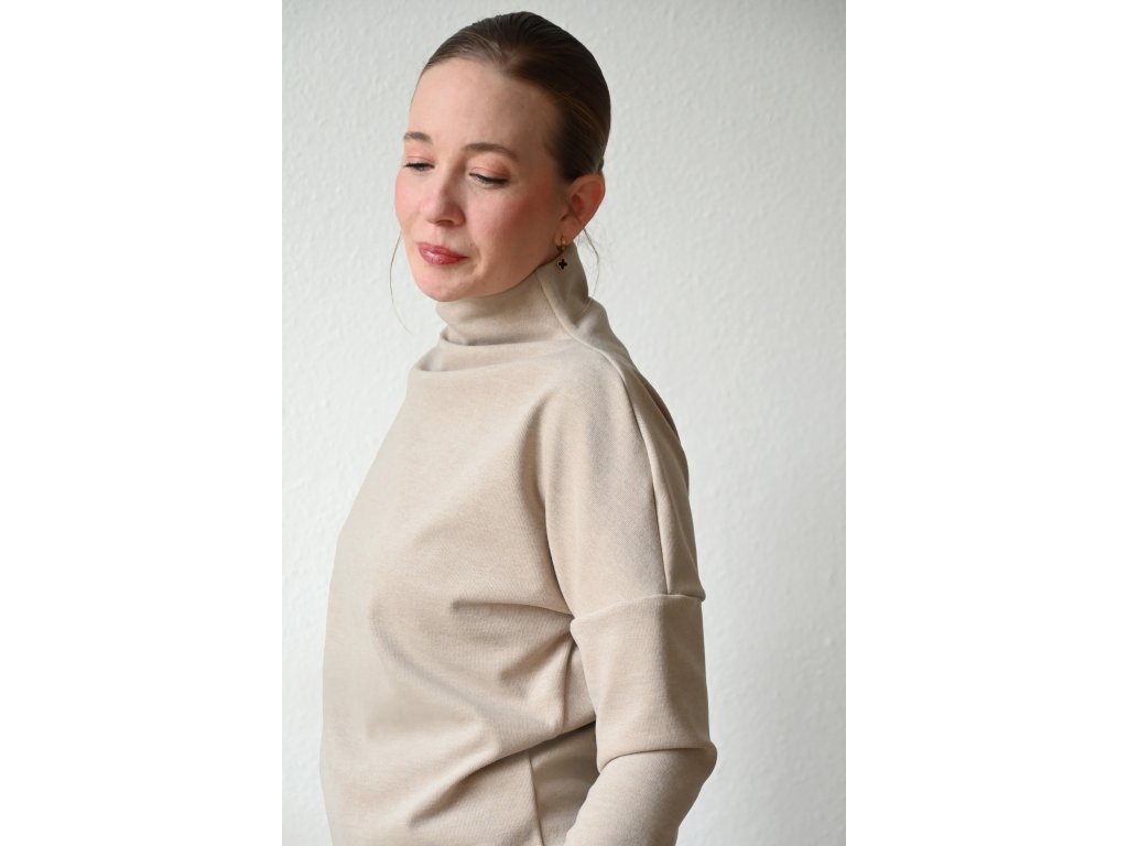 Dámský svetr s volnějším dvojitým stojáčkem, spadlými dlouhými rukávy a rovného střihu. Volnější přes hrudník. Působí volně a ležérně.