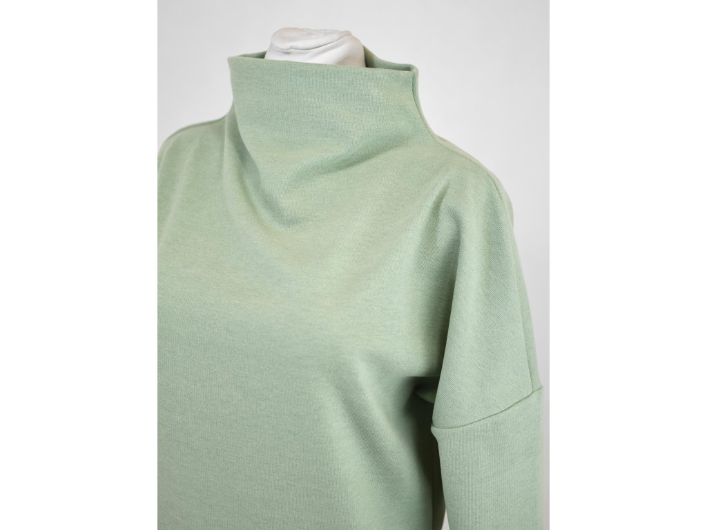 Dámský svetr s volnějším dvojitým stojáčkem, spadlými dlouhými rukávy a rovného střihu. Volnější přes hrudník. Působí volně a ležérně.