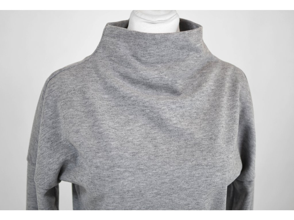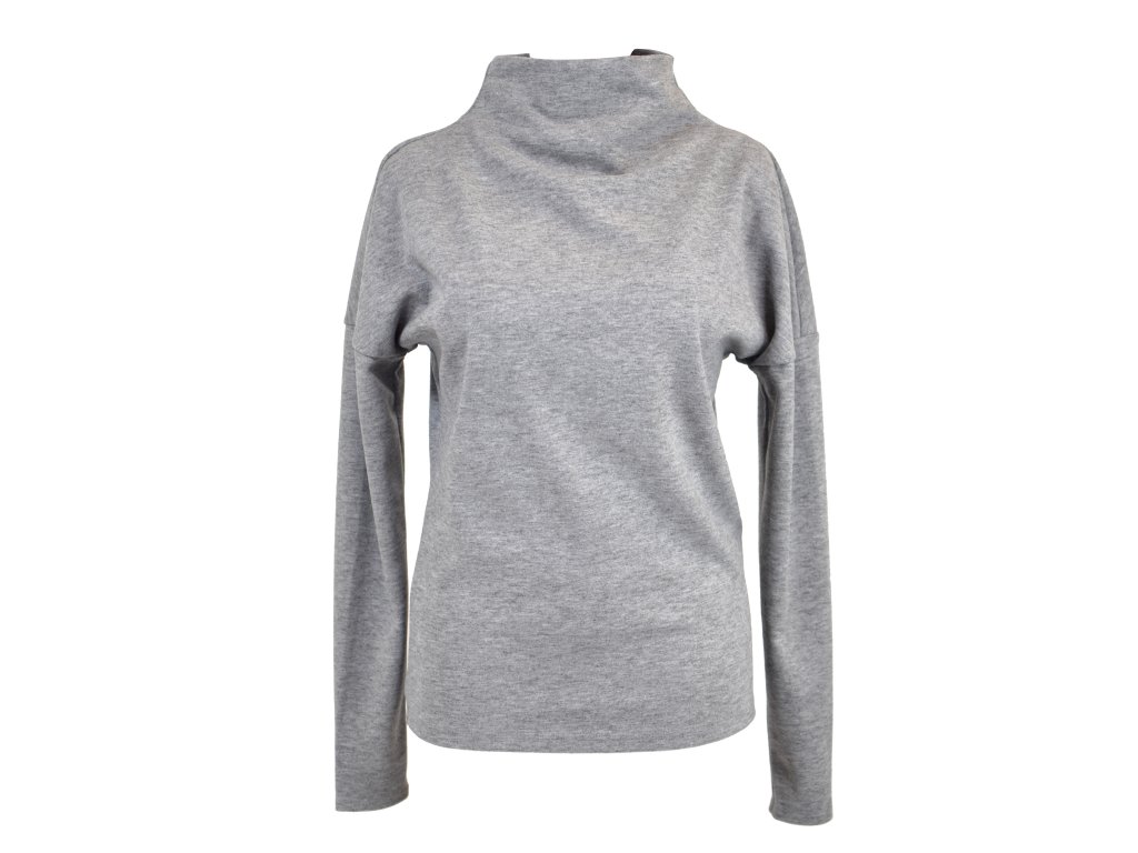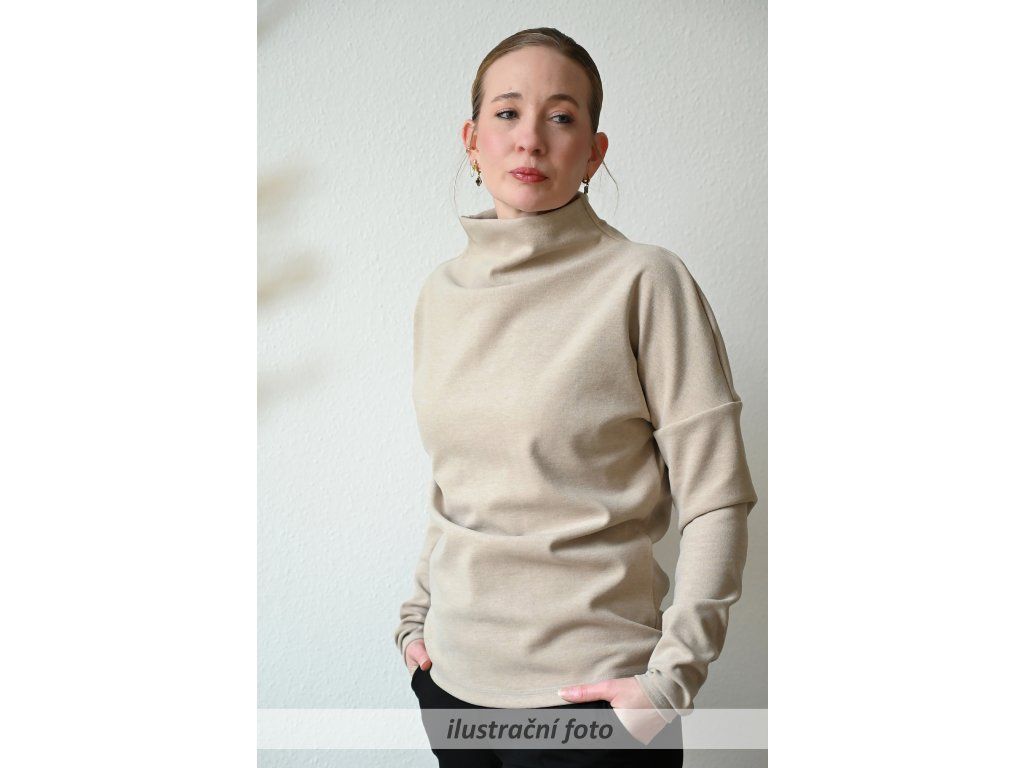Dámský svetr s volnějším dvojitým stojáčkem, spadlými dlouhými rukávy a rovného střihu. Volnější přes hrudník. Působí volně a ležérně.