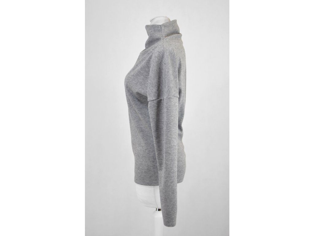 Dámský svetr s volnějším dvojitým stojáčkem, spadlými dlouhými rukávy a rovného střihu. Volnější přes hrudník. Působí volně a ležérně.