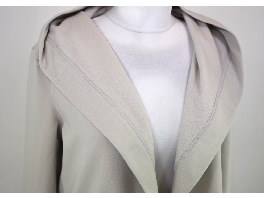 Dámský volnočasový "přehoz" s kapucí. Má jednotnou prodlouženou délku a dvojité klopy, zadní díl je do kulata. Střih je bez většího tvarování a bez zapínání... :) V bocích dvě kapsy. Látka je slabší než u předchozích.