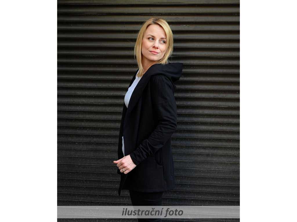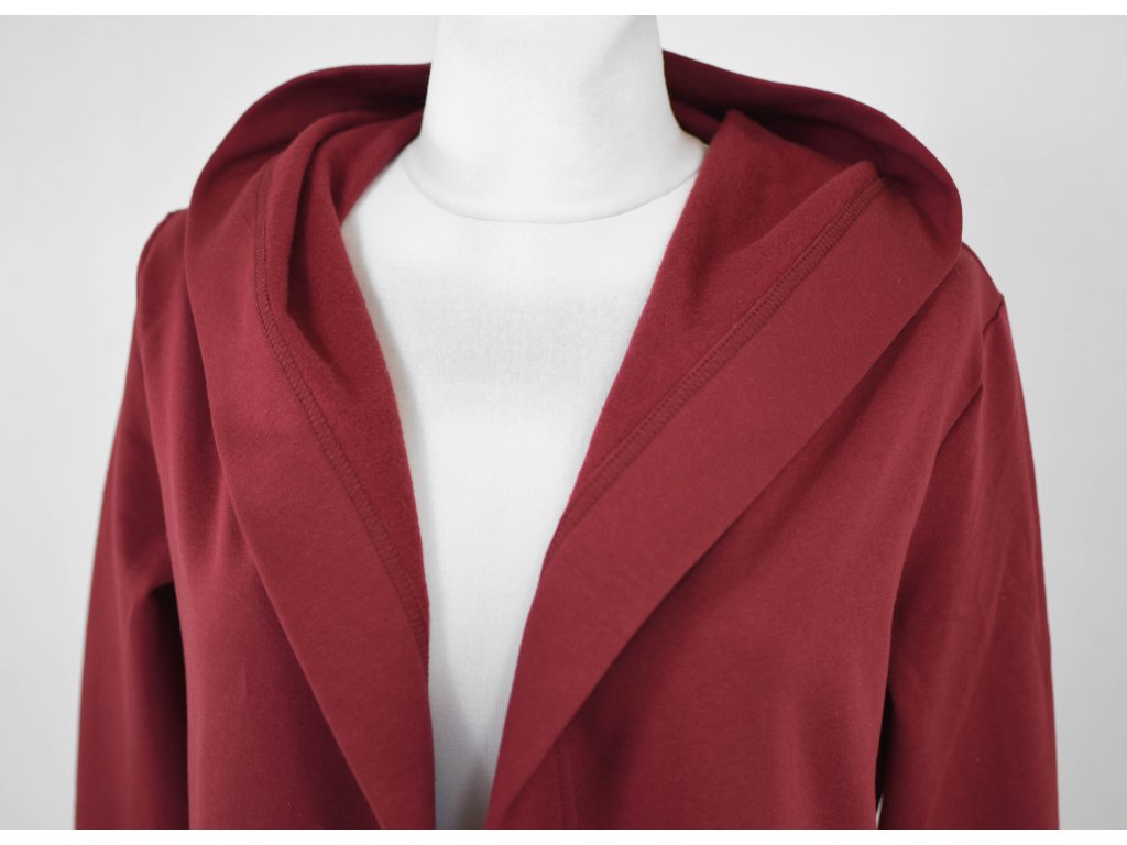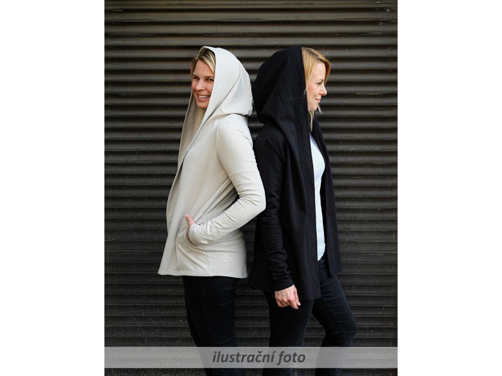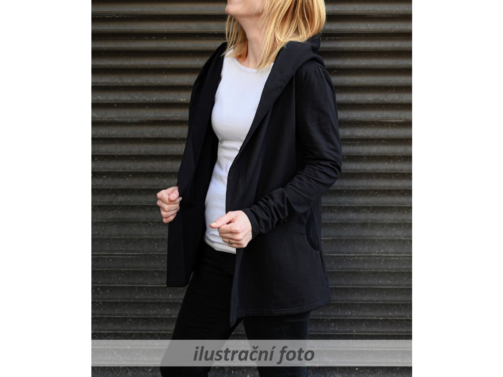 Dámský volnočasový "přehoz" s kapucí. Má jednotnou prodlouženou délku a dvojité klopy, zadní díl je do kulata. Střih je bez většího tvarování a bez zapínání... :) V bocích dvě kapsy. Látka je slabší než u předchozích.
