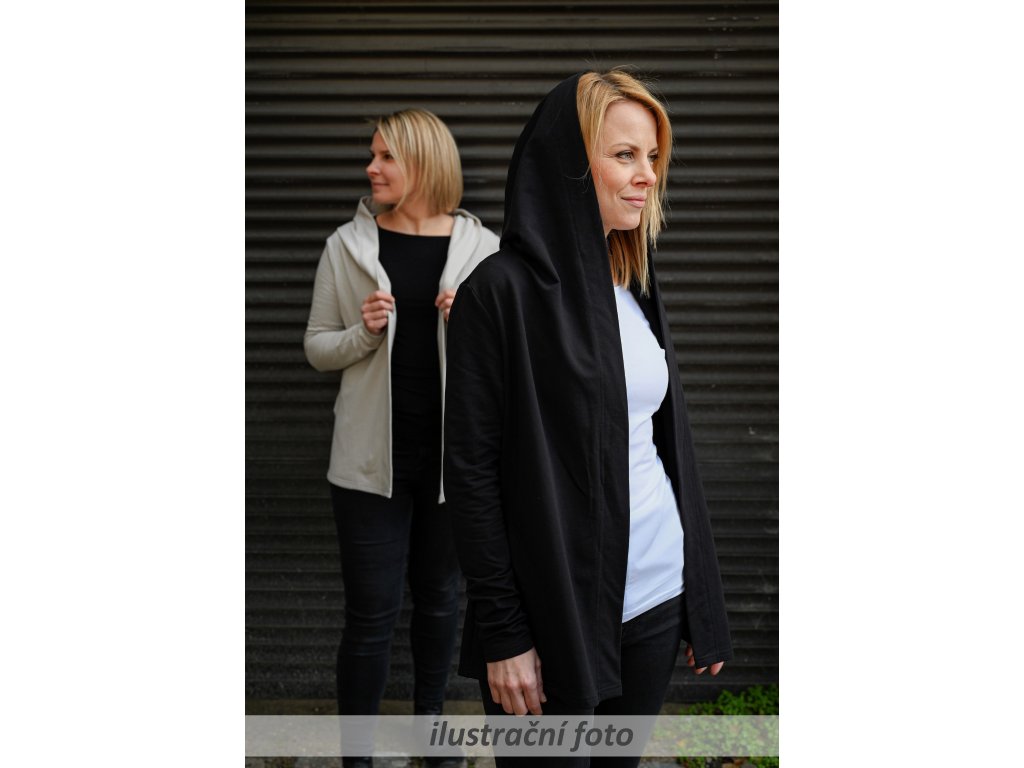 Dámský volnočasový "přehoz" s kapucí. Má jednotnou prodlouženou délku a dvojité klopy, zadní díl je do kulata. Střih je bez většího tvarování a bez zapínání... :) V bocích dvě kapsy. Látka je slabší než u předchozích.