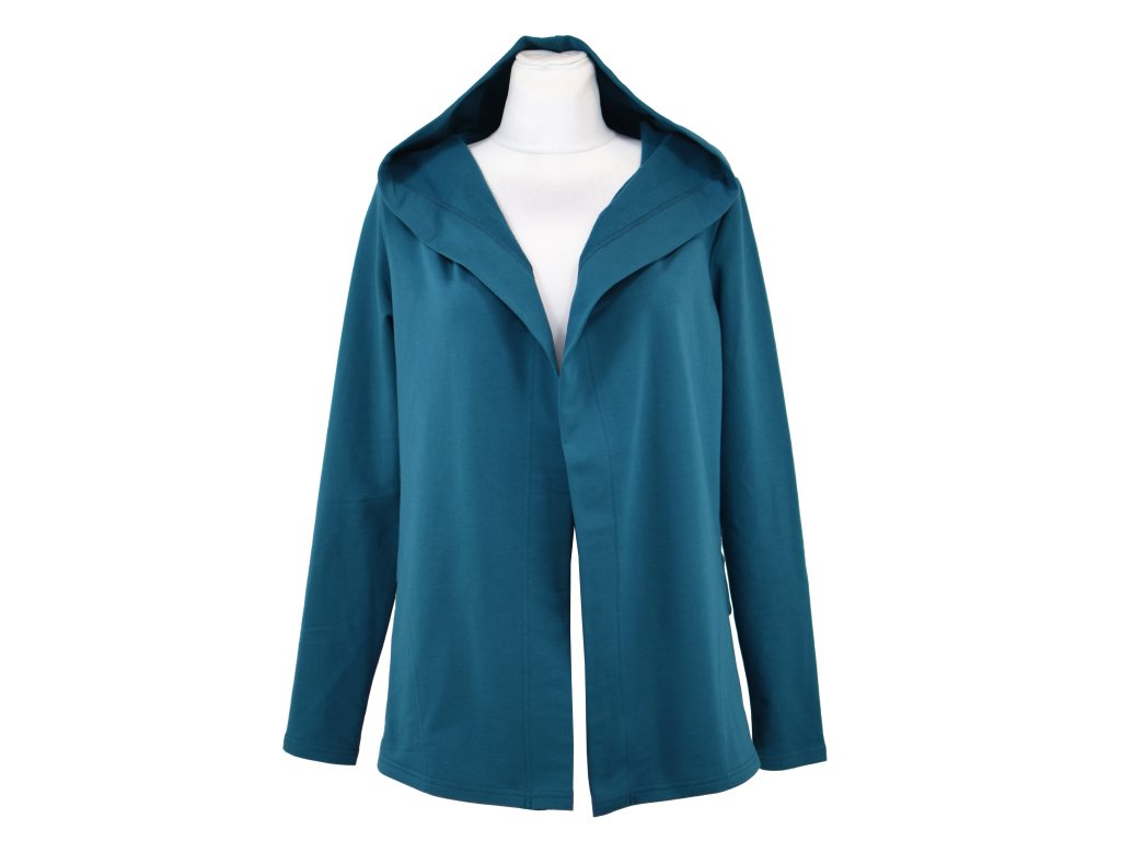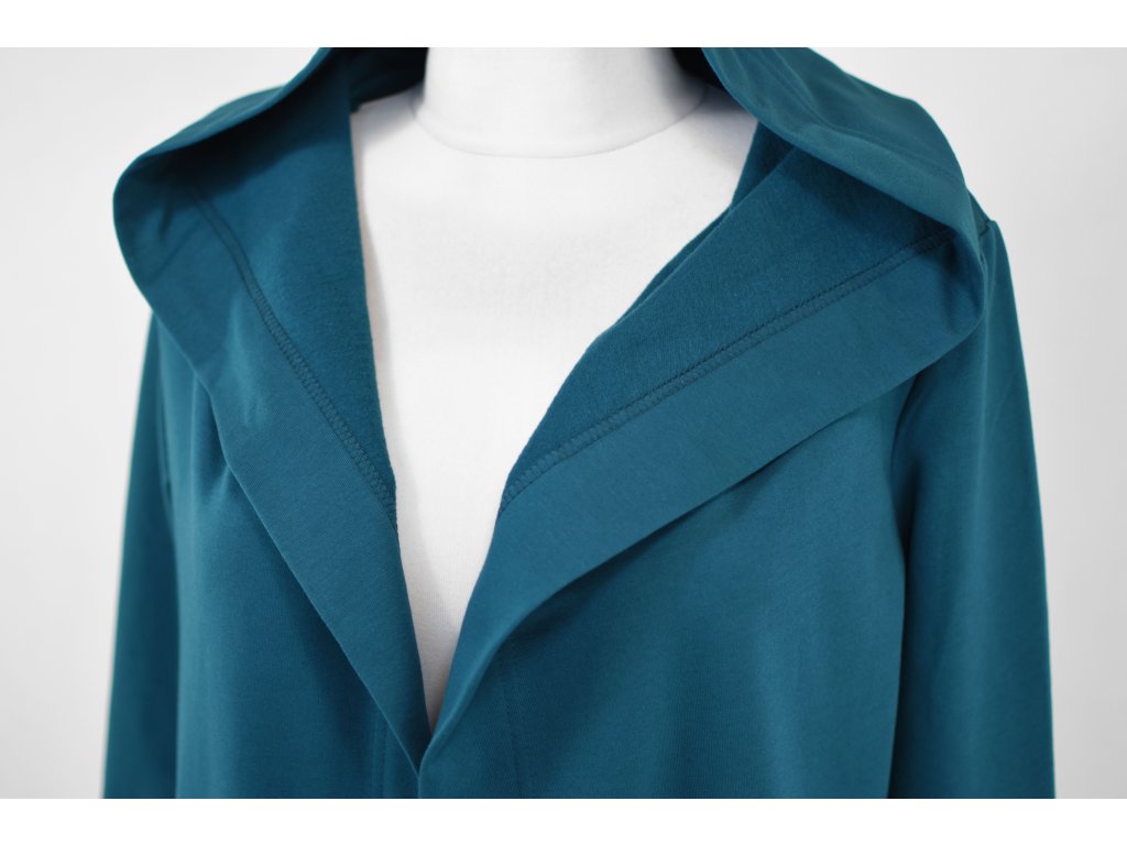 Dámský volnočasový "přehoz" s kapucí. Má jednotnou prodlouženou délku a dvojité klopy, zadní díl je do kulata. Střih je bez většího tvarování a bez zapínání... :) V bocích dvě kapsy. Látka je slabší než u předchozích.