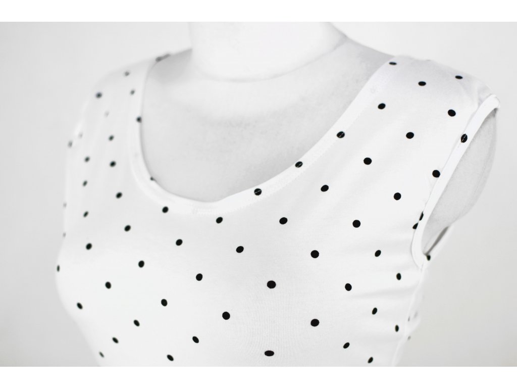 Dámské tílko z elastického úpletu. V pase projmutého střihu, lodičkový výstřih, ramínka širší. Opravdu velký výstřih.