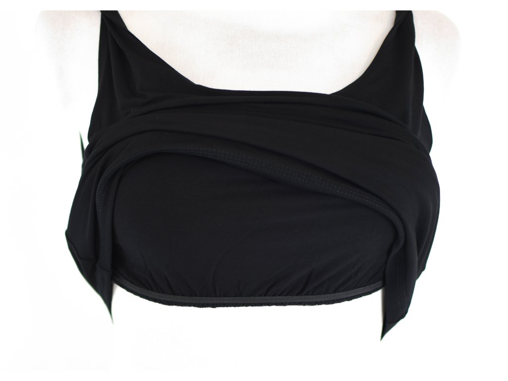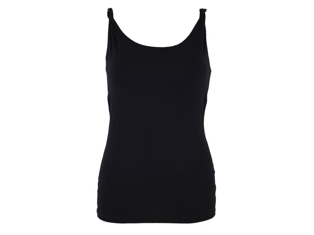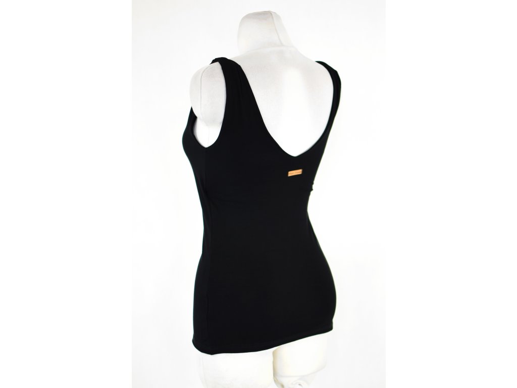 Dámské tílko z bambusového elastického úpletu. V pase lehce projmuté, kulatý výstřih vepředu, vzadu hlubší výstřih spíše do V. Mají zdvojenou látku v oblasti hrudníku zakončenou gumičkou. Tílko dělá zajímavým detail v podobě přetočených ramínek.