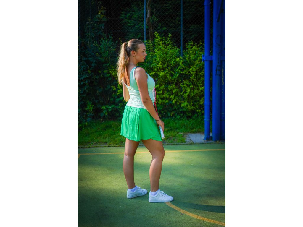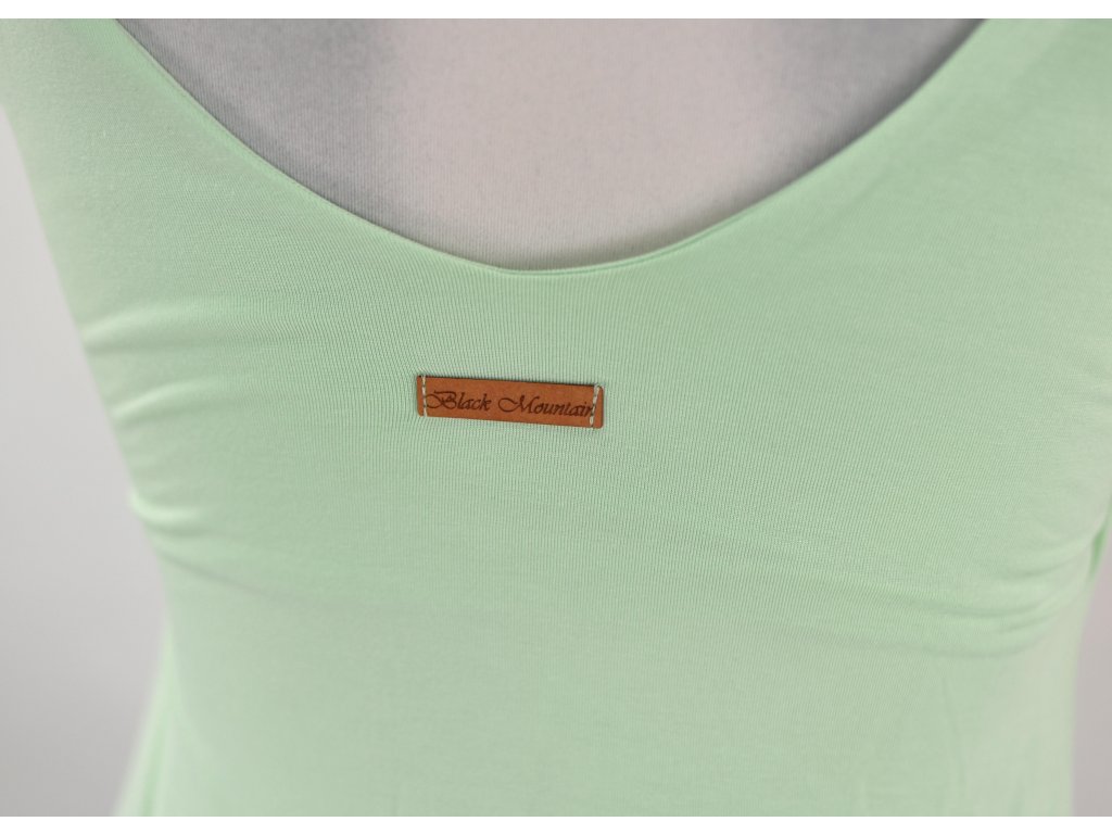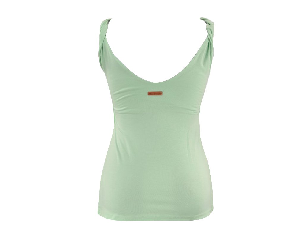 Dámské tílko z bambusového elastického úpletu. V pase lehce projmuté, kulatý výstřih vepředu, vzadu hlubší výstřih spíše do V. Mají zdvojenou látku v oblasti hrudníku zakončenou gumičkou. Tílko dělá zajímavým detail v podobě přetočených ramínek.