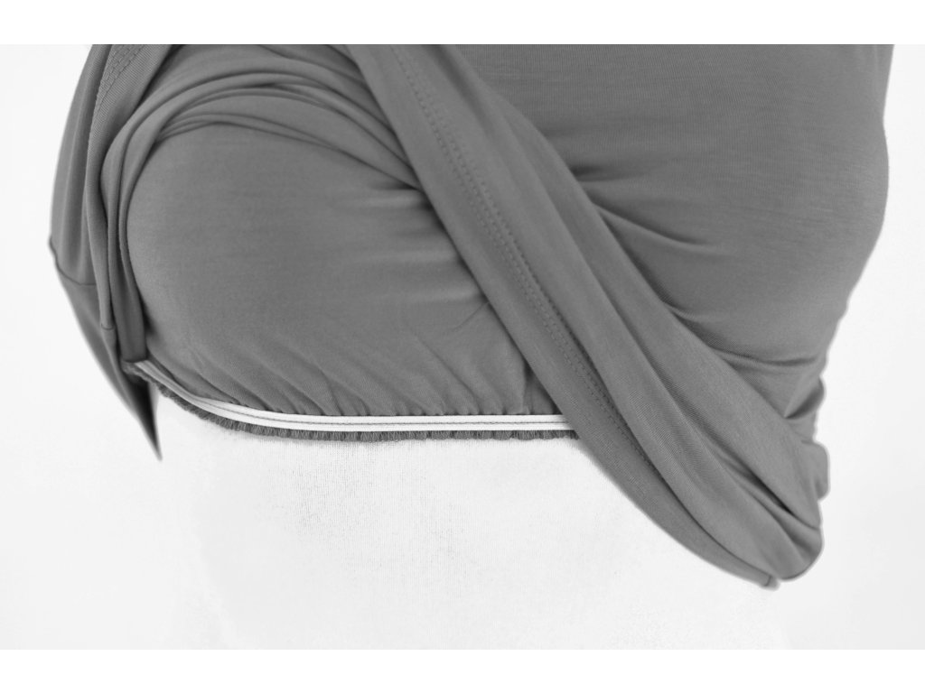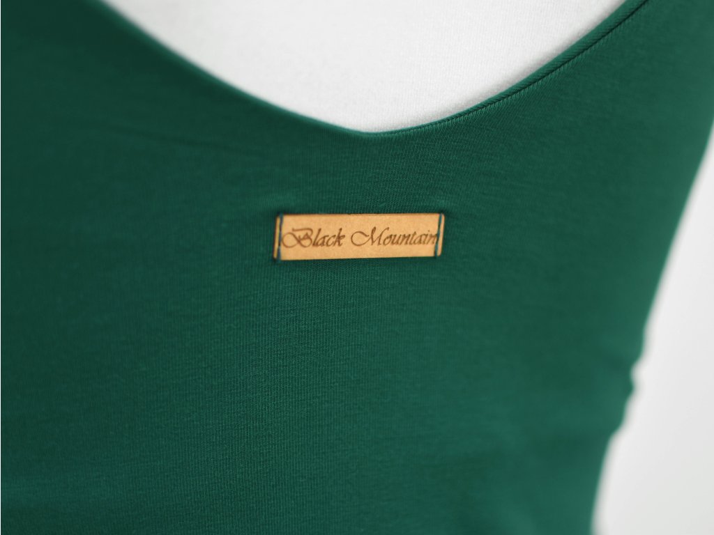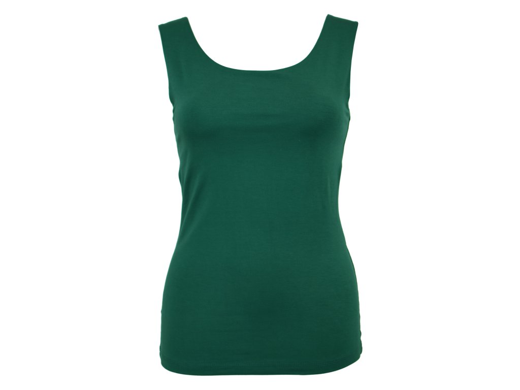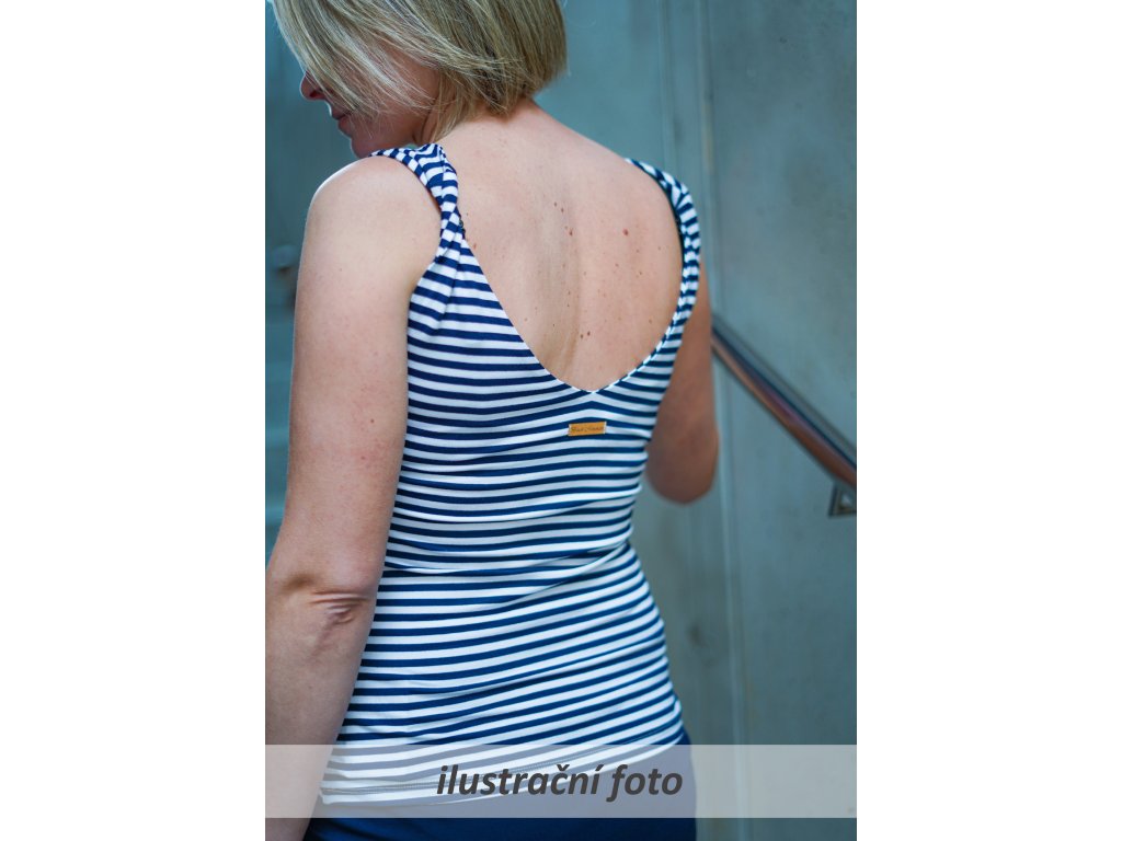 Dámské tílko z bambusového elastického úpletu. V pase lehce projmuté, kulatý výstřih vepředu, vzadu hlubší výstřih spíše do V. Mají zdvojenou látku v oblasti hrudníku zakončenou gumičkou. Tílko dělá zajímavým detail v podobě přetočených ramínek.