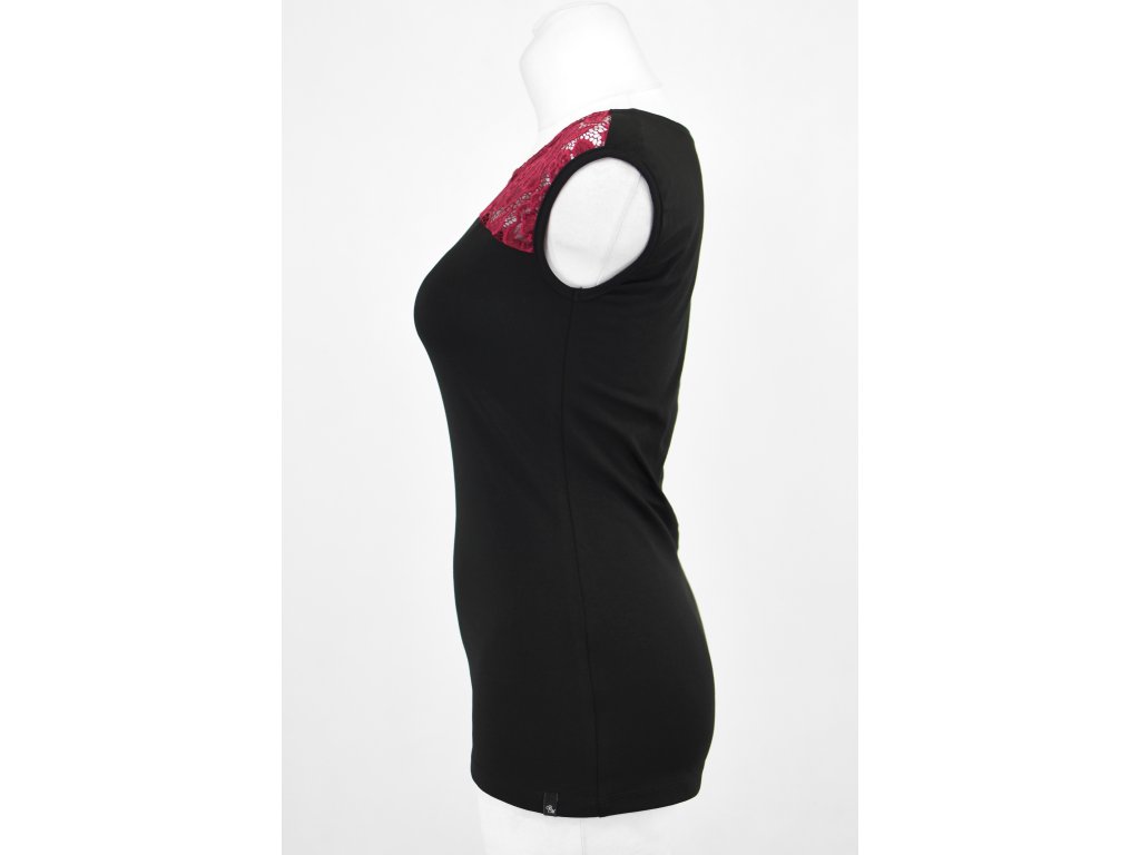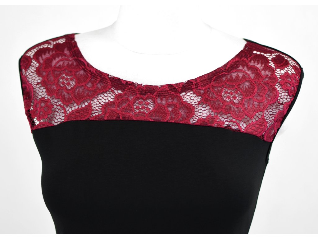 Dámské tílko z elastického úpletu, dekolt tvořený jemnou krajkou. V pase projmutého střihu, lodičkový výstřih, ramínka širší.