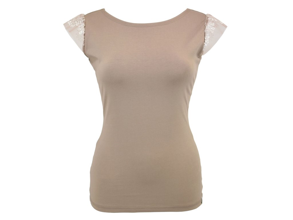 Dámské tričko z elastického úpletu. V pase projmutého střihu, lodičkový výstřih, rukávky jsou tvořeny jemnou krajkou.