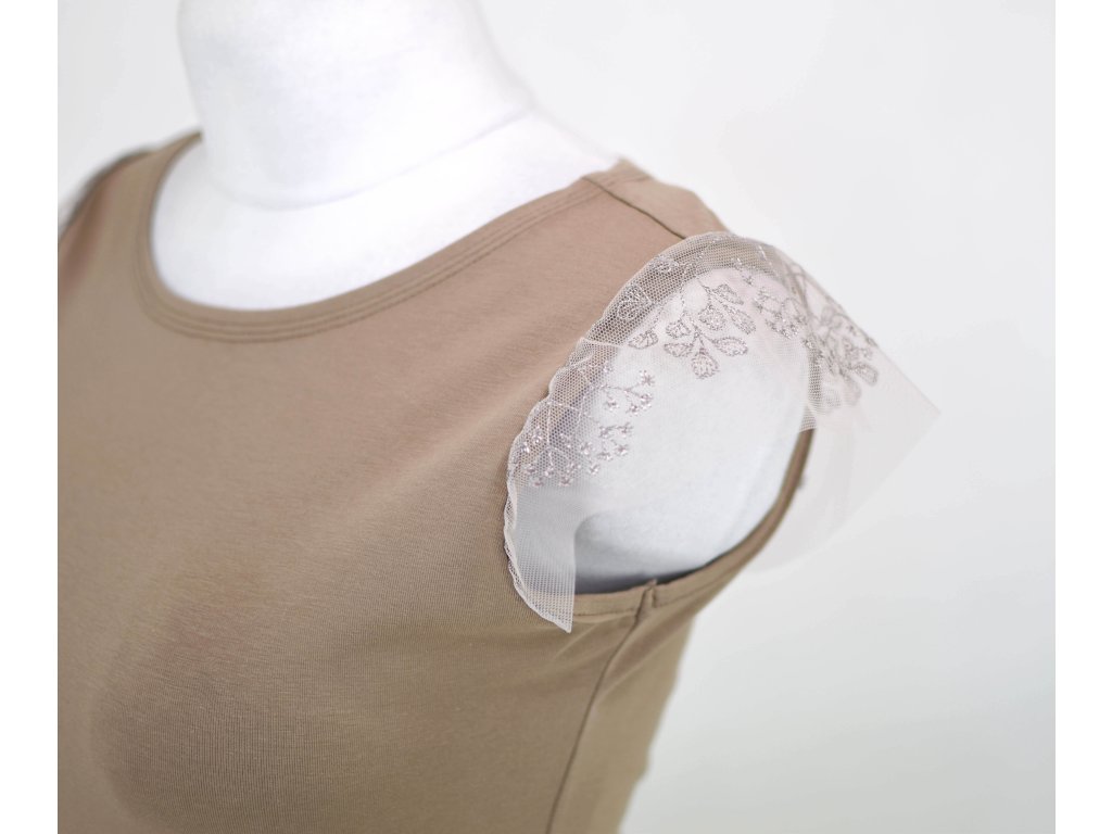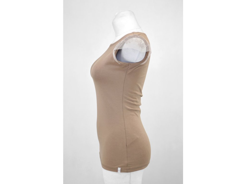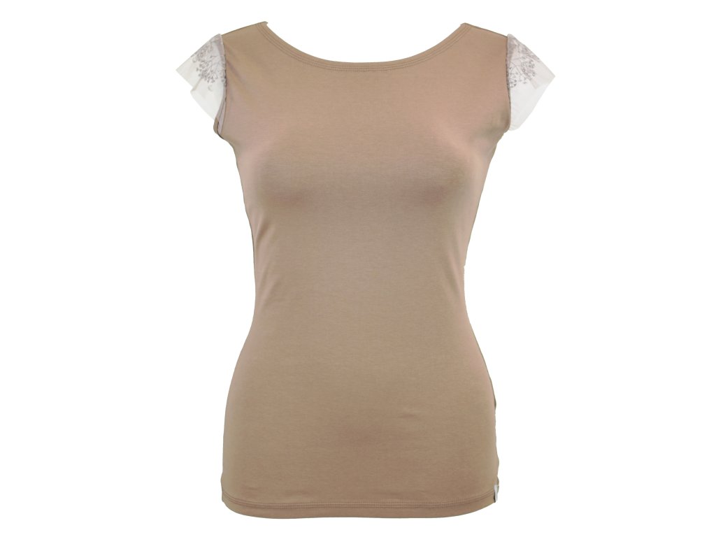 Dámské tričko z elastického úpletu. V pase projmutého střihu, lodičkový výstřih, rukávky jsou tvořeny jemnou krajkou.