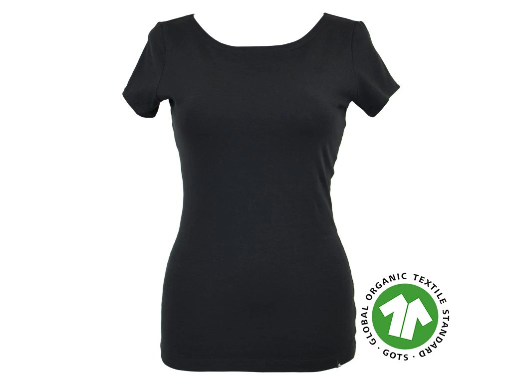 Dámské tričko z příjemného elastického úpletu. V pase projmuté, lodičkový výstřih.