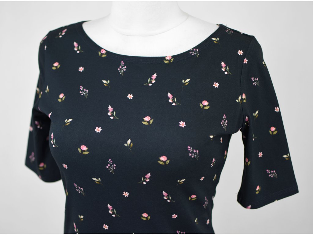 Dámské tričko z příjemného elastického úpletu. V pase projmuté, lodičkový výstřih. Rukávek je delší, ale stále nad loket. :)