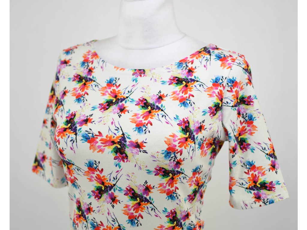 Dámské tričko z příjemného elastického úpletu. V pase projmuté, lodičkový výstřih. Rukávek je delší, ale stále nad loket. :)