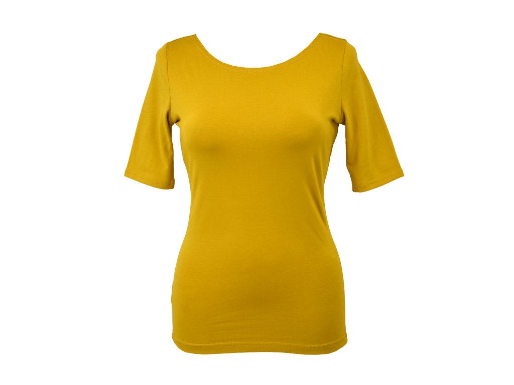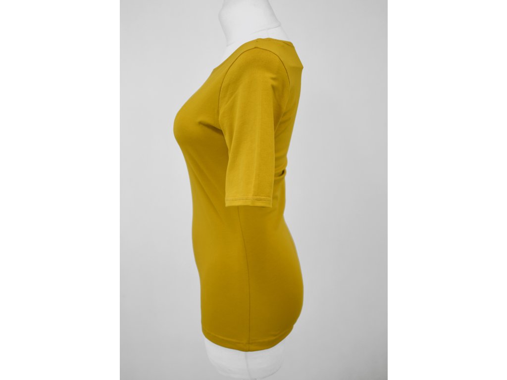 Dámské tričko z příjemného elastického úpletu. V pase projmuté, lodičkový výstřih. Rukávek je delší, ale stále nad loket. :)