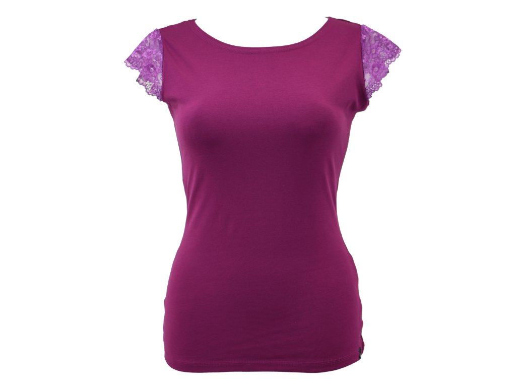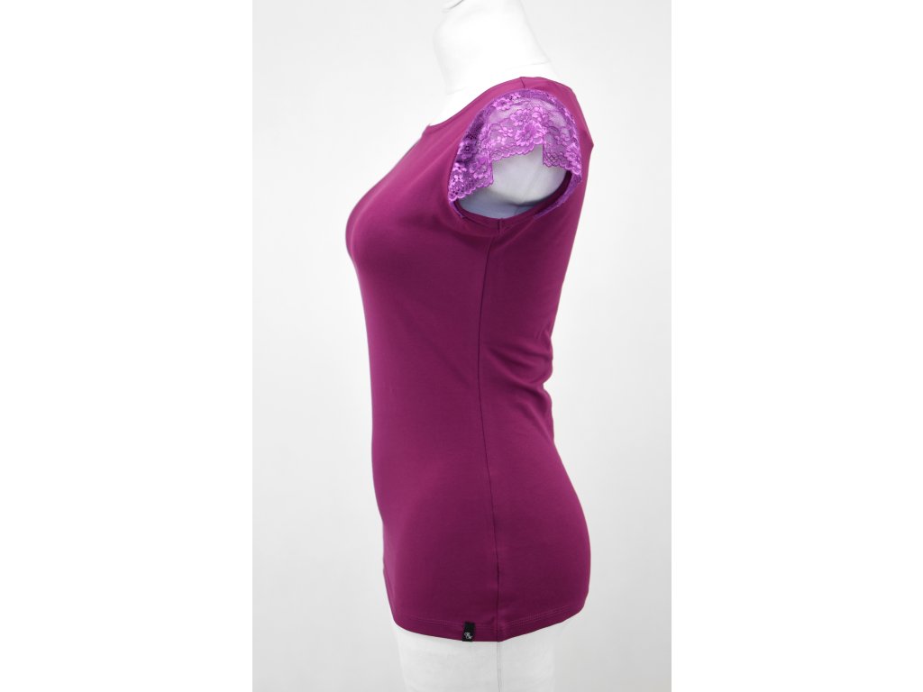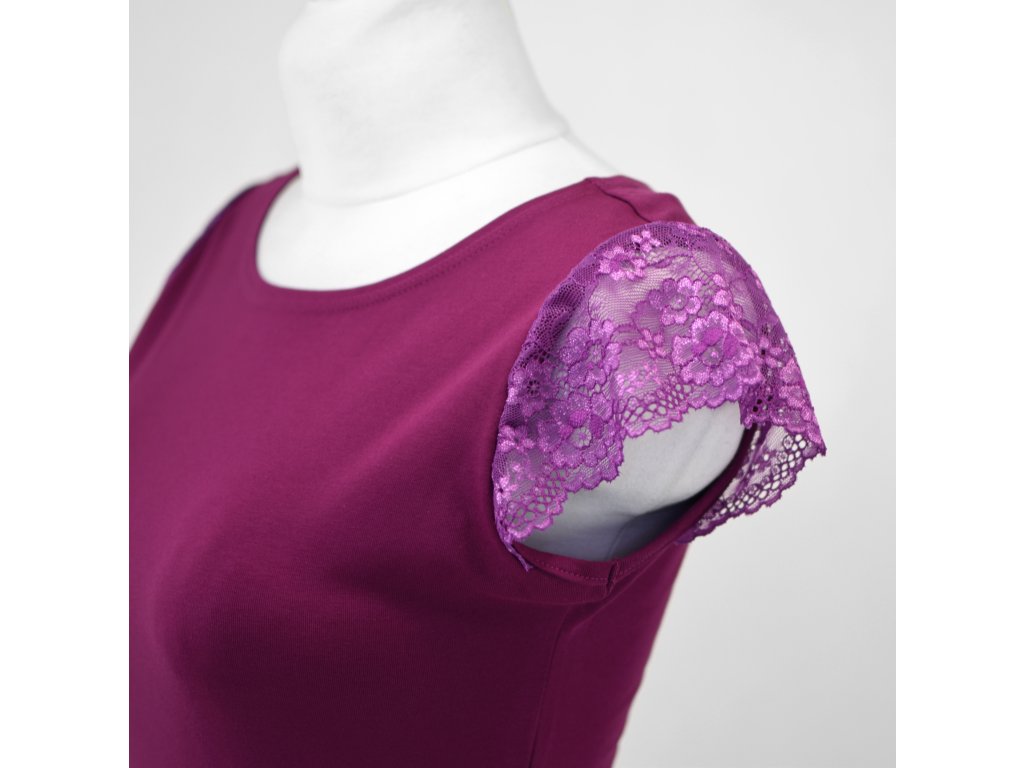 Dámské tričko z elastického úpletu. V pase projmutého střihu, lodičkový výstřih, rukávky jsou tvořeny jemnou krajkou.