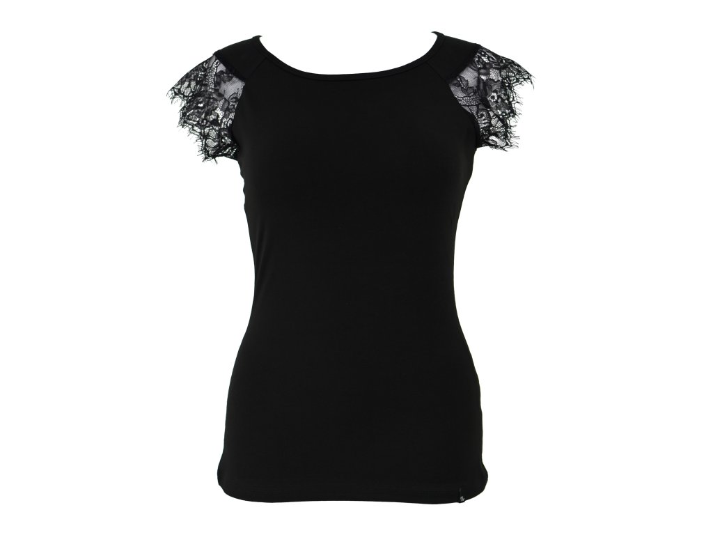 Dámské tričko z elastického úpletu. V pase projmutého střihu, lodičkový výstřih, rukávky jsou tvořeny jemnou krajkou.