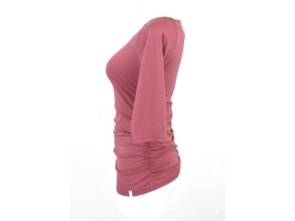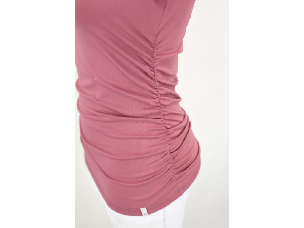 Dámské tričko s klínovými rukávy s vykrojenějším výstřihem do ramenou ne do hloubky. V bocích jsou řasené gumičkou z předního i zadního dílu.