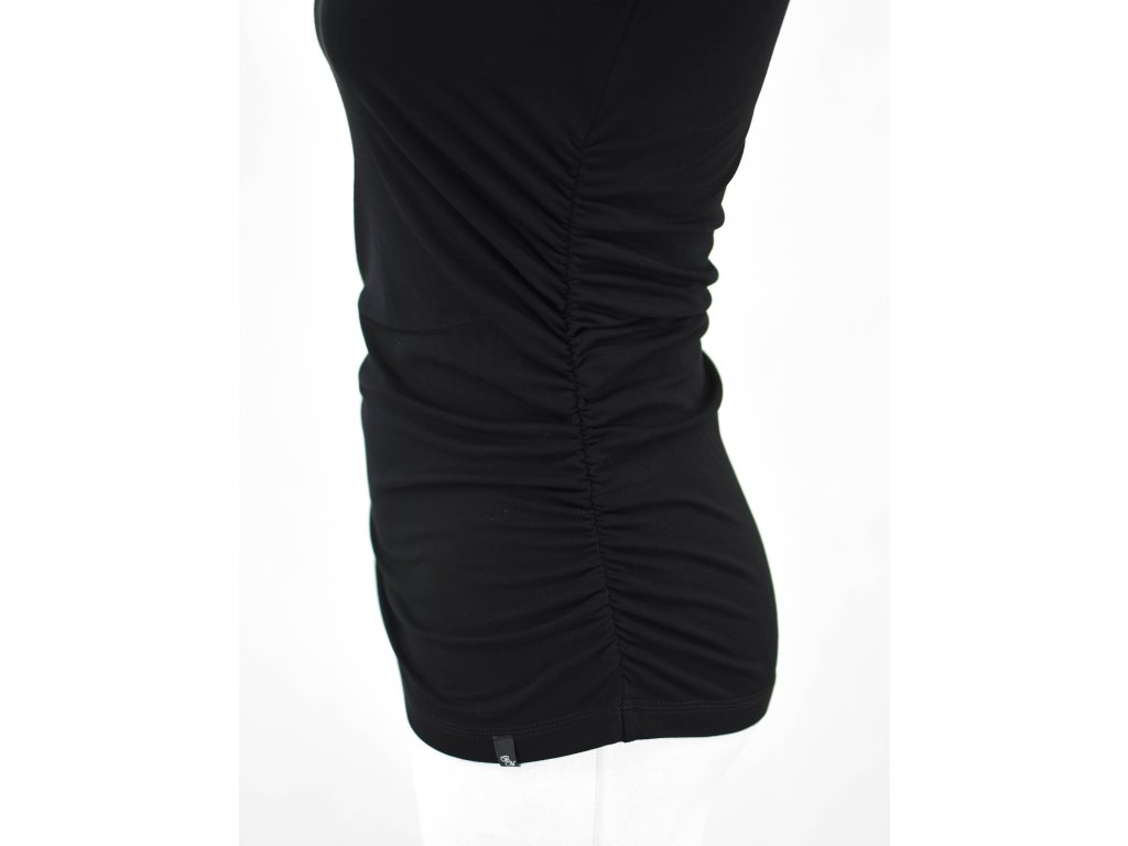 Dámské tričko s klínovými rukávy s vykrojenějším výstřihem do ramenou ne do hloubky. V bocích jsou řasené gumičkou z předního i zadního dílu, řasení je až dolů. Délka je lehce prodloužená a v pase je jen mírně projmuté. Bambus je velmi příjemný, antibakteriální, jemný a má i mírný lesk.