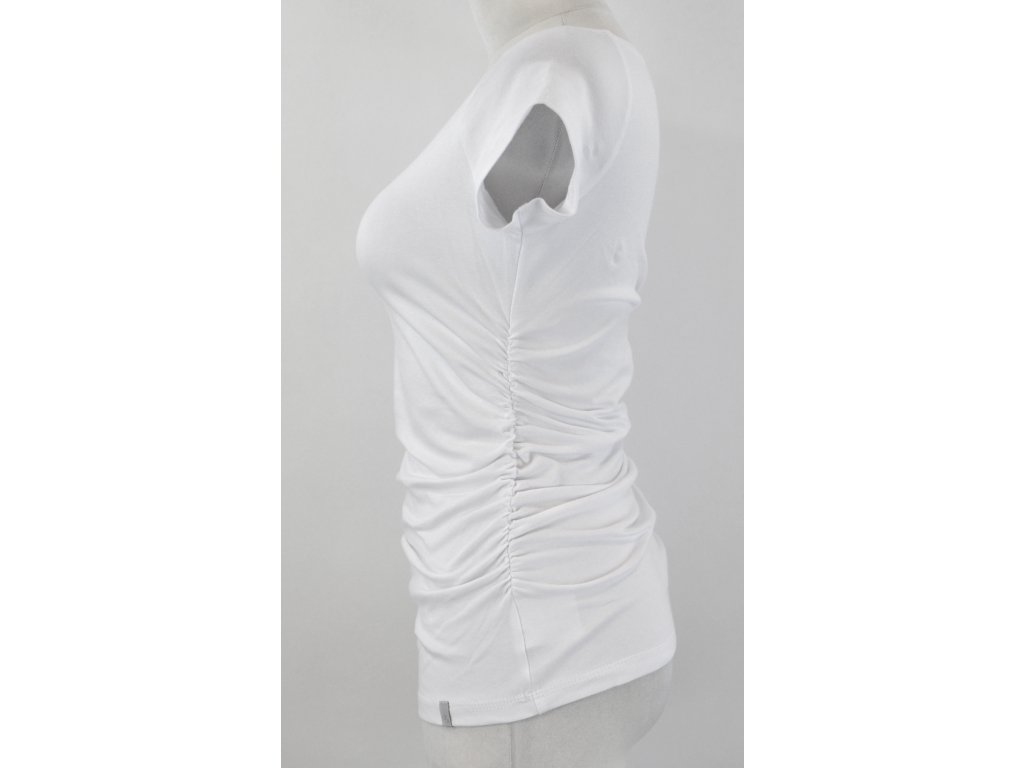 Dámské tričko s klínovými rukávy s vykrojenějším výstřihem do ramenou ne do hloubky. V bocích jsou řasené gumičkou z předního i zadního dílu.