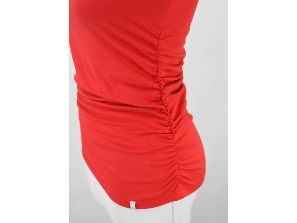 Dámské tričko s klínovými rukávy s vykrojenějším výstřihem do ramenou ne do hloubky. V bocích jsou řasené gumičkou z předního i zadního dílu.