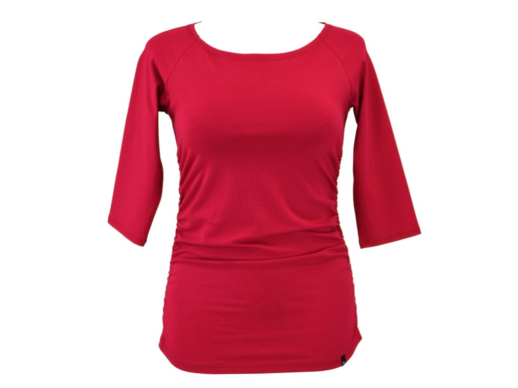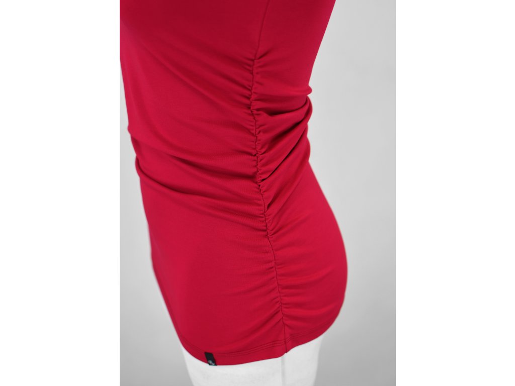 Dámské tričko s klínovými rukávy s vykrojenějším výstřihem do ramenou ne do hloubky. V bocích jsou řasené gumičkou z předního i zadního dílu.