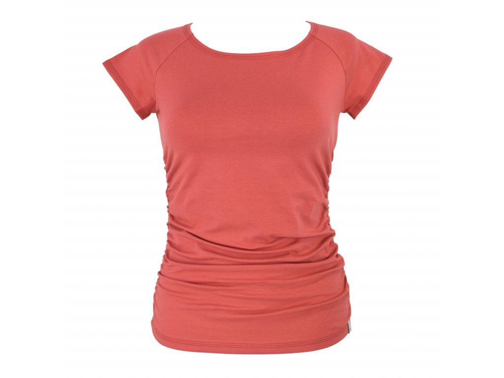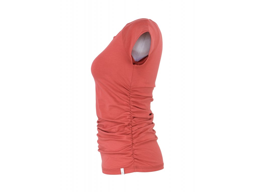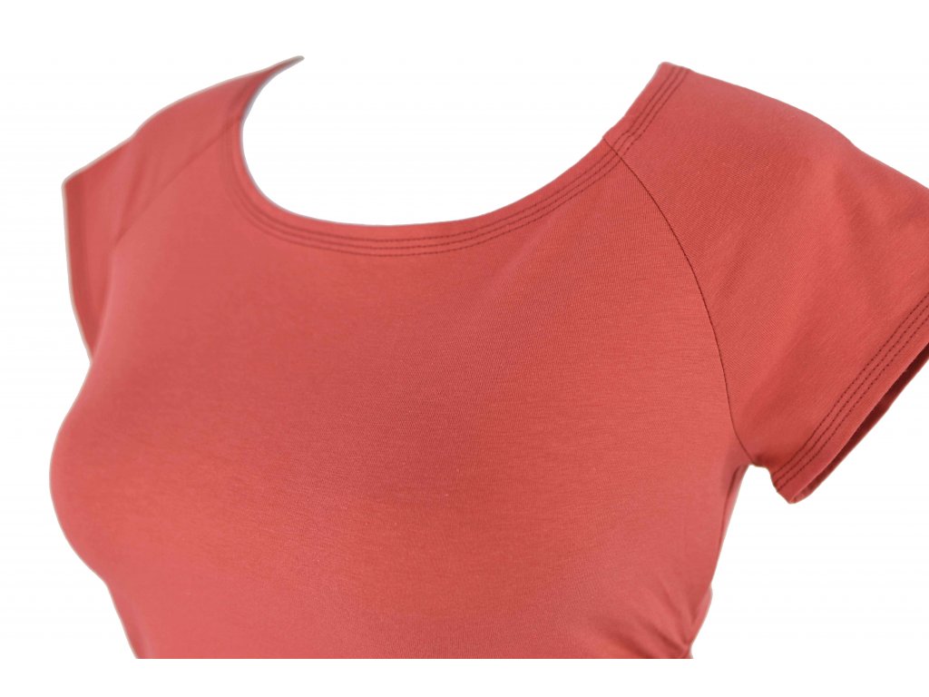 Dámské tričko s klínovými rukávy s vykrojenějším výstřihem do ramenou ne do hloubky. V bocích jsou řasené gumičkou z předního i zadního dílu.