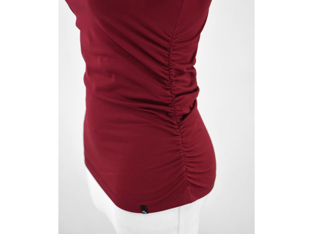 Dámské tričko s klínovými rukávy s vykrojenějším výstřihem do ramenou ne do hloubky. V bocích jsou řasené gumičkou z předního i zadního dílu, řasení je až dolů. Délka je lehce prodloužená a v pase je jen mírně projmuté. :)