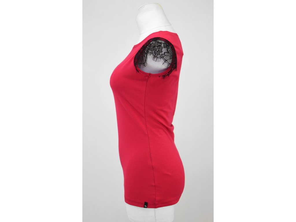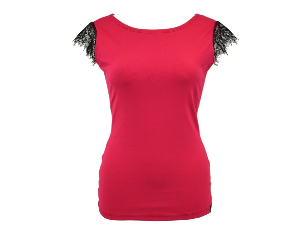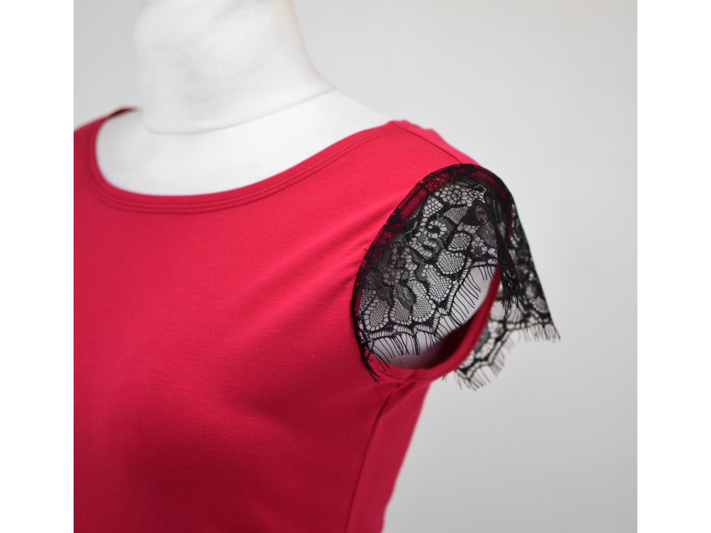 Dámské tričko z elastického úpletu. V pase projmutého střihu, lodičkový výstřih, rukávky jsou tvořeny jemnou krajkou.