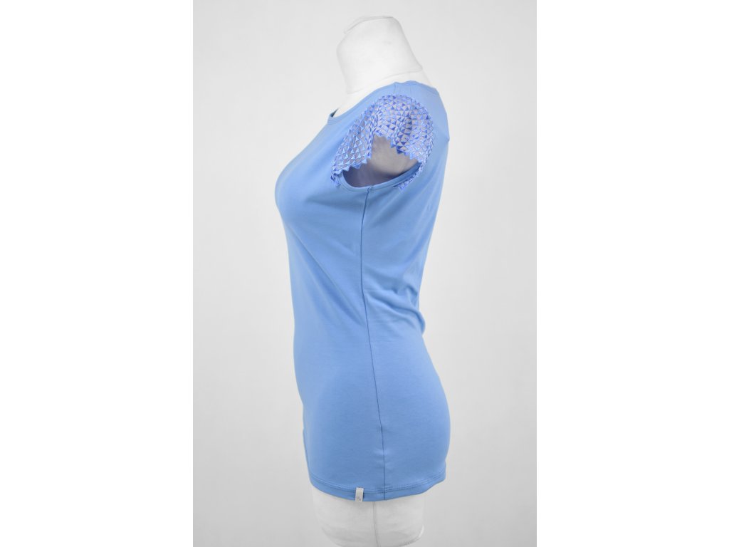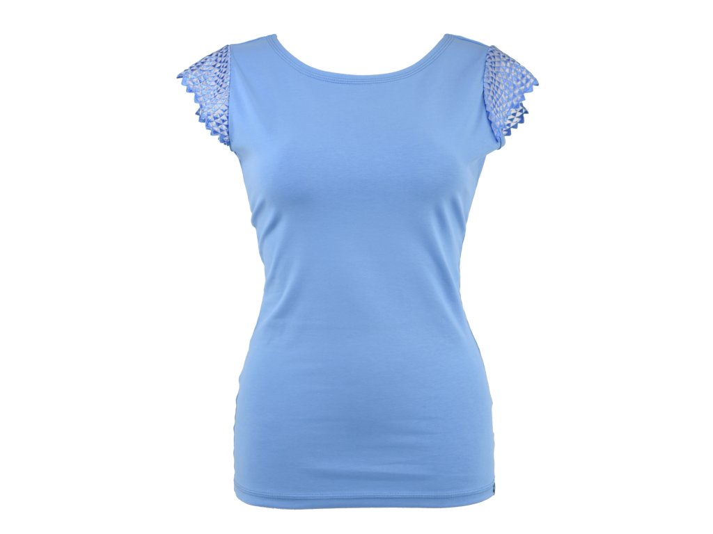 Dámské tričko z elastického úpletu. V pase projmutého střihu, lodičkový výstřih, rukávky jsou tvořeny jemnou krajkou.