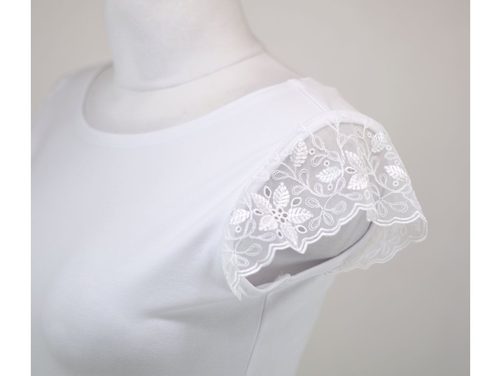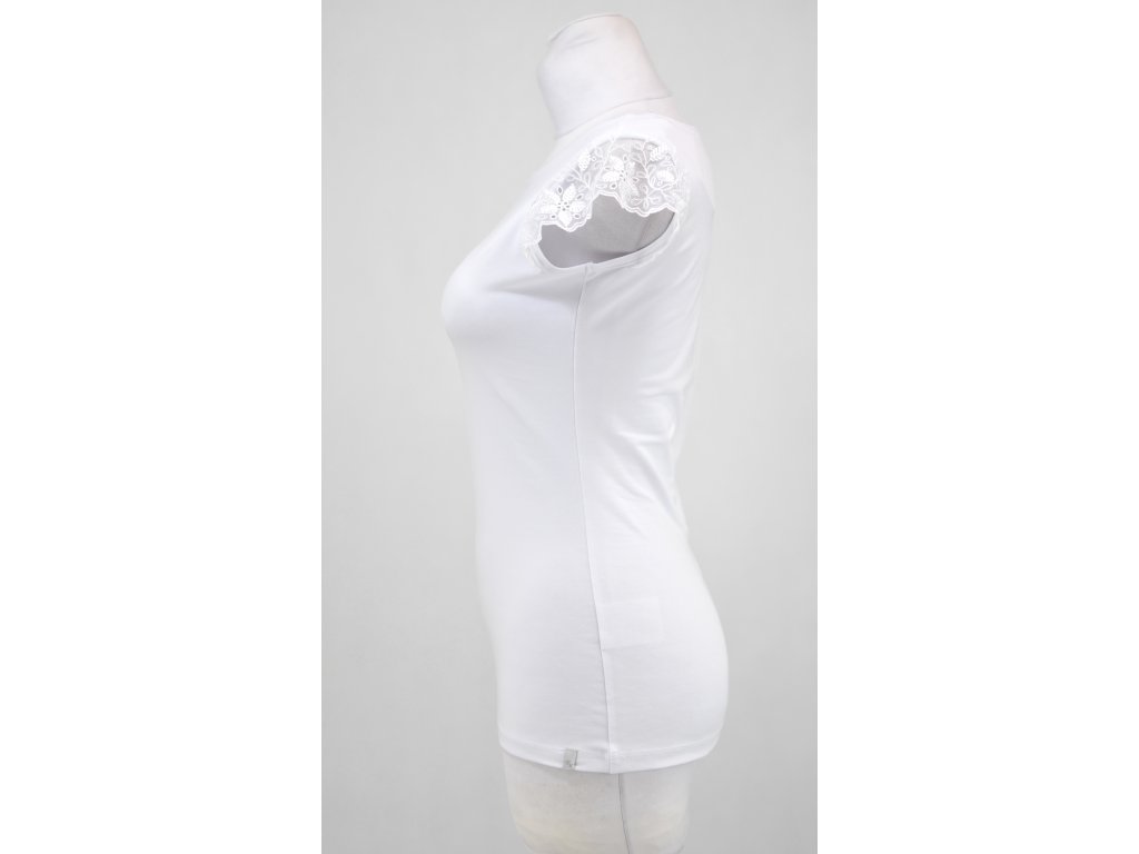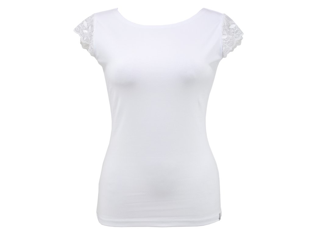 Dámské tričko z elastického úpletu. V pase projmutého střihu, lodičkový výstřih, rukávky jsou tvořeny jemnou krajkou.