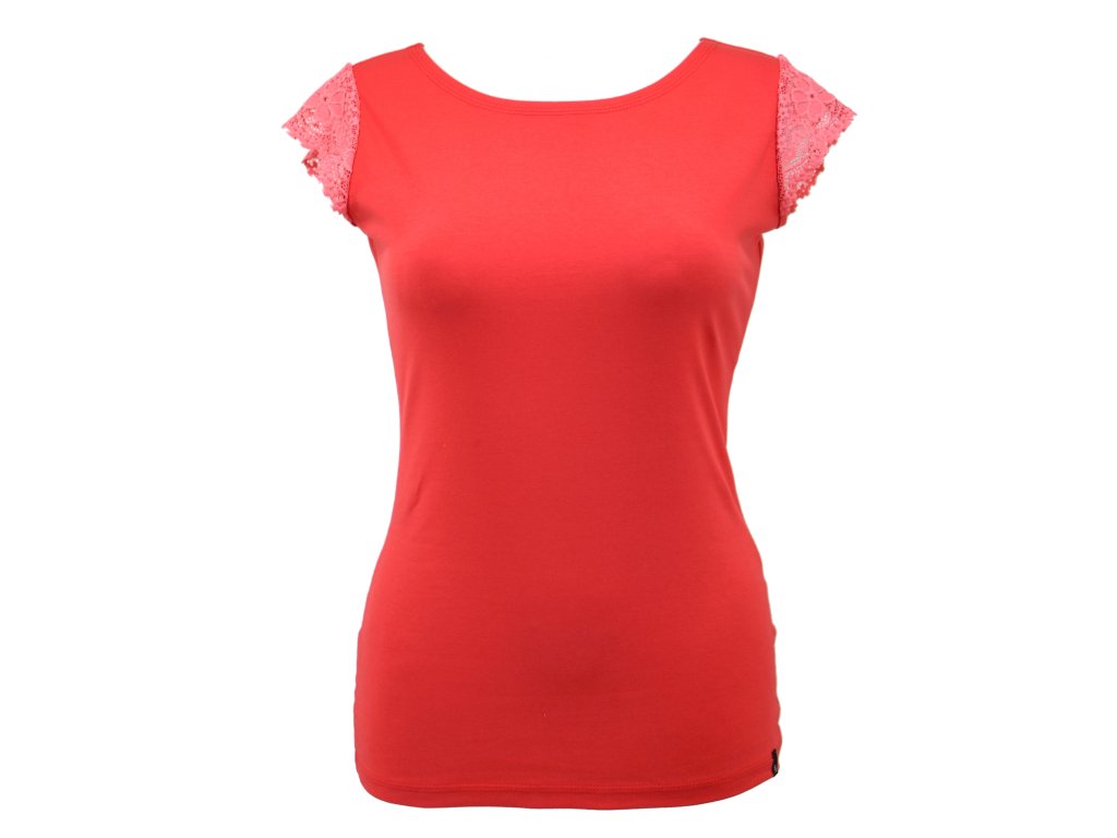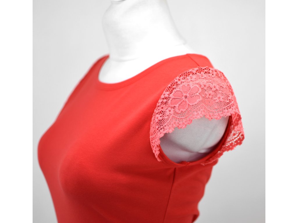 Dámské tričko z elastického úpletu. V pase projmutého střihu, lodičkový výstřih, rukávky jsou tvořeny jemnou krajkou.