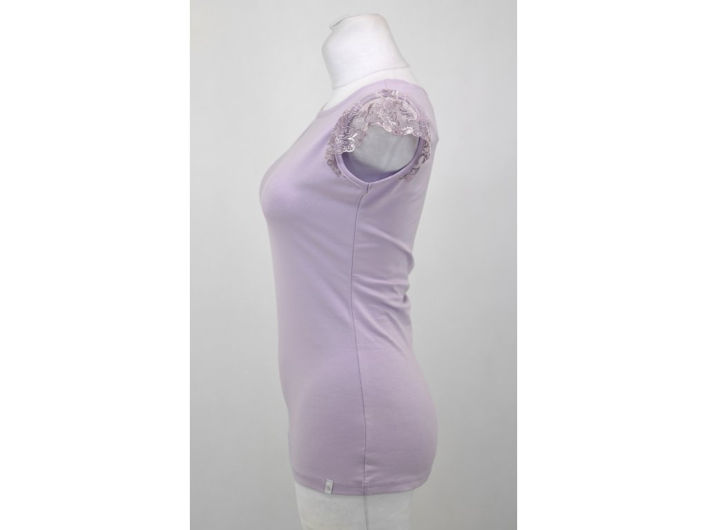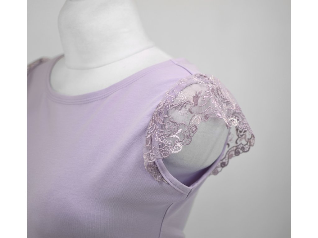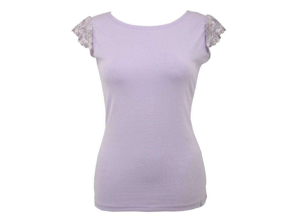 Dámské tričko z elastického úpletu. V pase projmutého střihu, lodičkový výstřih, rukávky jsou tvořeny jemnou krajkou.