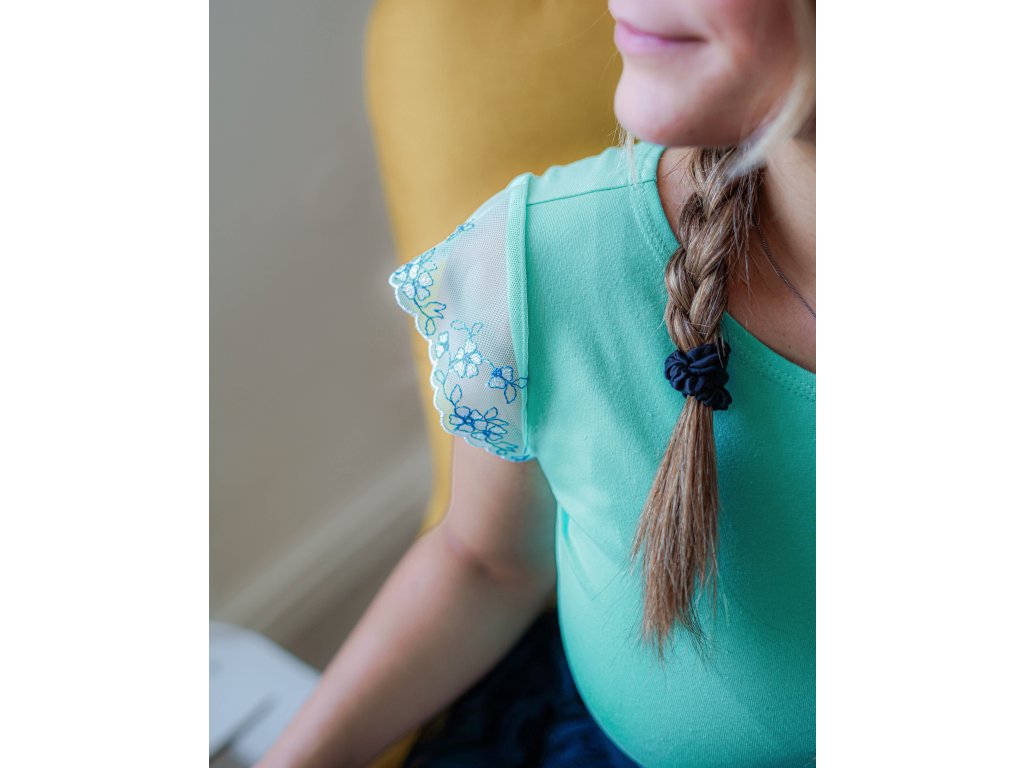 Dámské tričko z elastického úpletu. V pase projmutého střihu, lodičkový výstřih, rukávky jsou tvořeny jemnou krajkou.