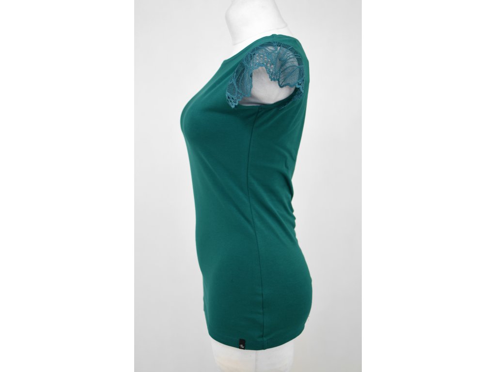 Dámské tričko z elastického úpletu. V pase projmutého střihu, lodičkový výstřih, rukávky jsou tvořeny jemnou krajkou.