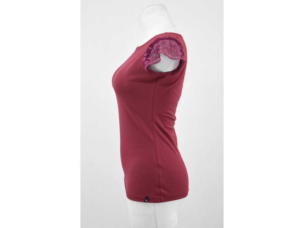 Dámské tričko z elastického úpletu. V pase projmutého střihu, lodičkový výstřih, rukávky jsou tvořeny jemnou krajkou.