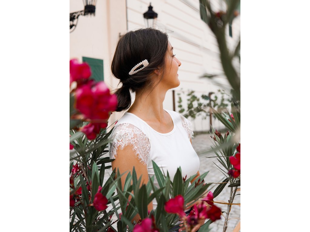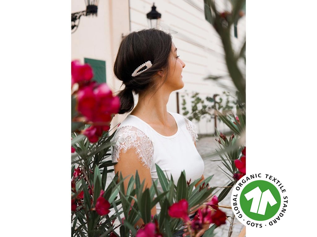 Dámské tričko z elastického úpletu. V pase projmutého střihu, lodičkový výstřih, rukávky jsou tvořeny jemnou krajkou.