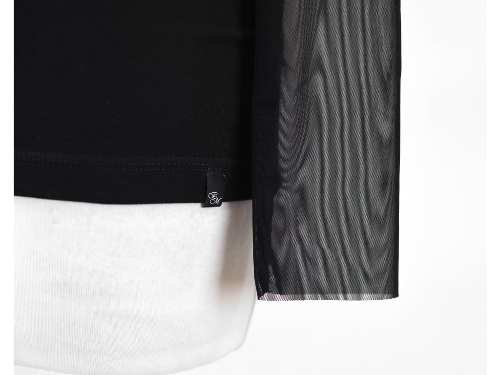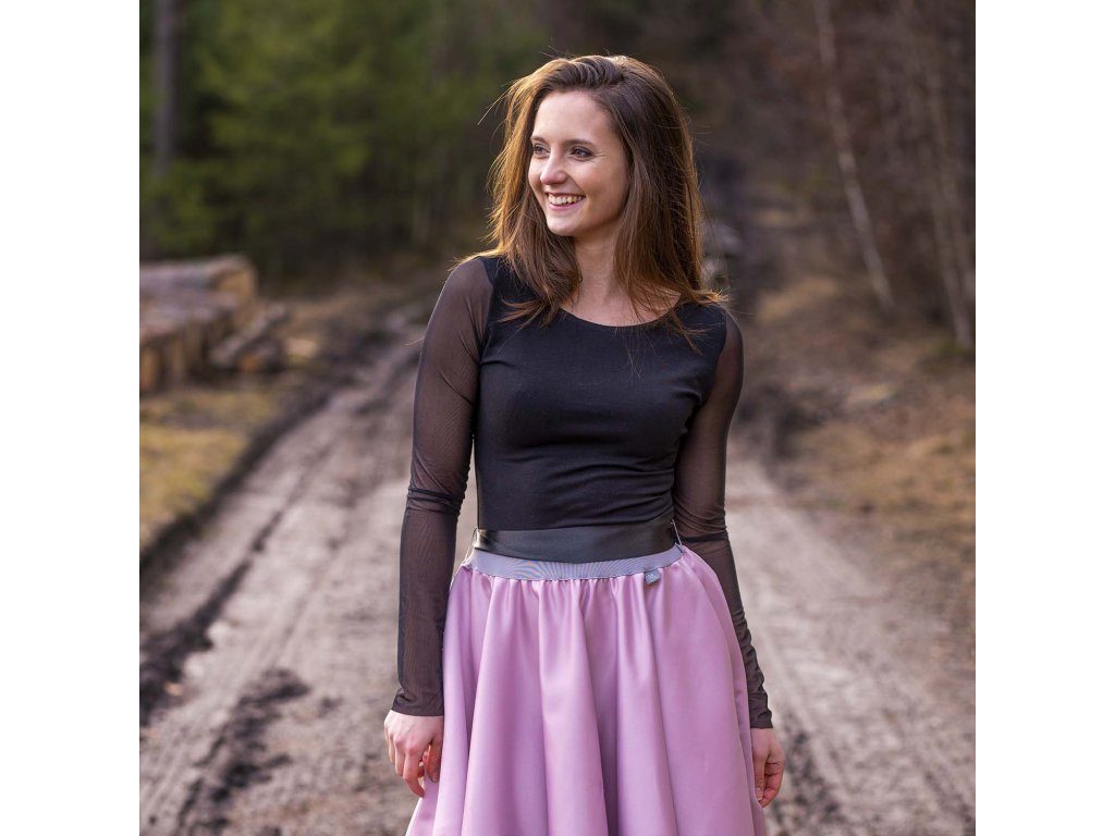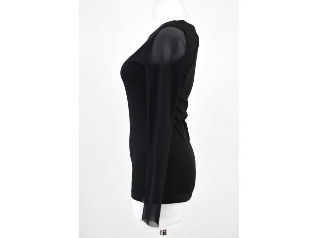 Dámské tričko z příjemného elastického úpletu. V pase projmuté, lodičkový výstřih, rukávy jsou z jemného hladkého tylu, pruží a lehce se leskne, na konci je nezačištěný.