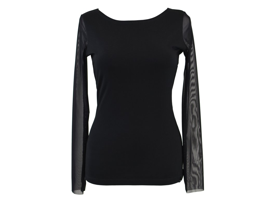 Dámské tričko z příjemného elastického úpletu. V pase projmuté, lodičkový výstřih, rukávy jsou z jemného hladkého tylu, pruží a lehce se leskne, na konci je nezačištěný.