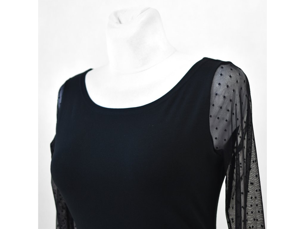 Dámské tričko z příjemného elastického úpletu. V pase projmuté, lodičkový výstřih, rukávy jsou z jemného hladkého tylu, pruží a lehce se leskne, na konci je začištěný.