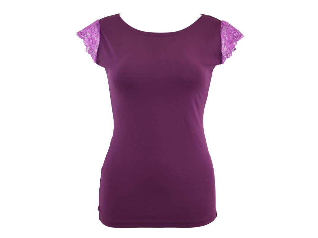 Dámské tričko z elastického úpletu. V pase projmutého střihu, lodičkový výstřih, rukávky jsou tvořeny jemnou krajkou.