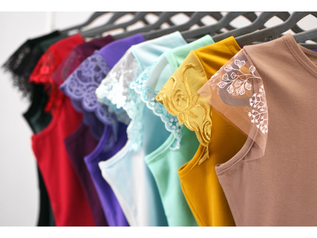 Dámské tričko z elastického úpletu. V pase projmutého střihu, lodičkový výstřih, rukávky jsou tvořeny jemnou krajkou.
