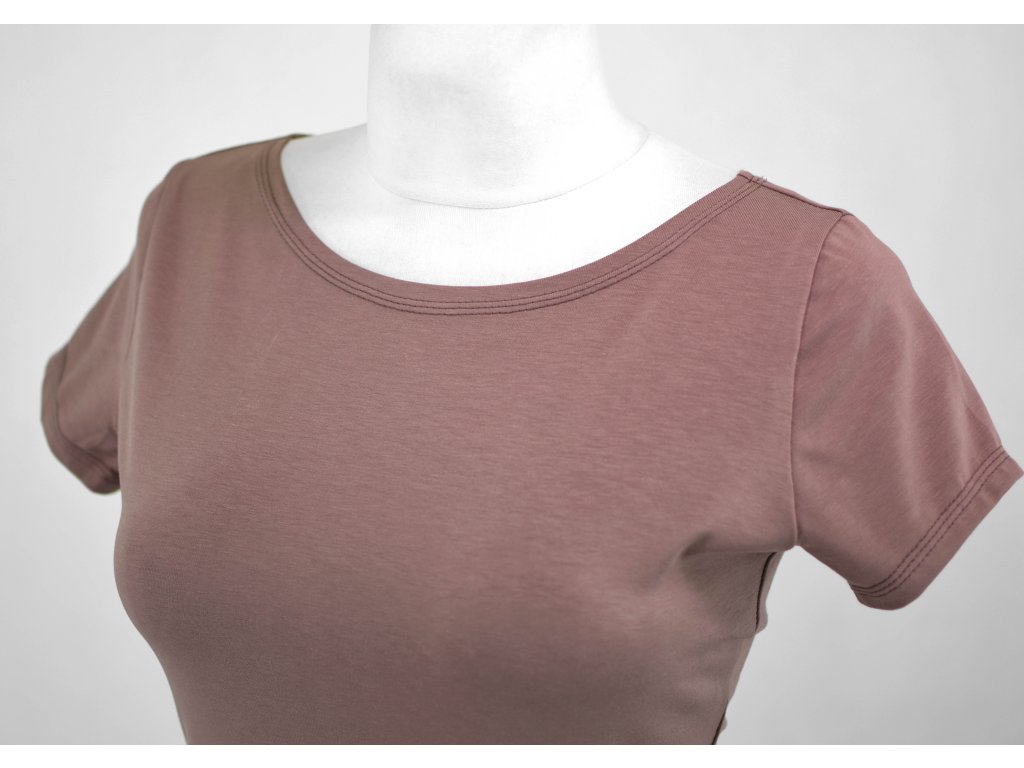 Dámské tričko z příjemného elastického úpletu. V pase projmuté, lodičkový výstřih.