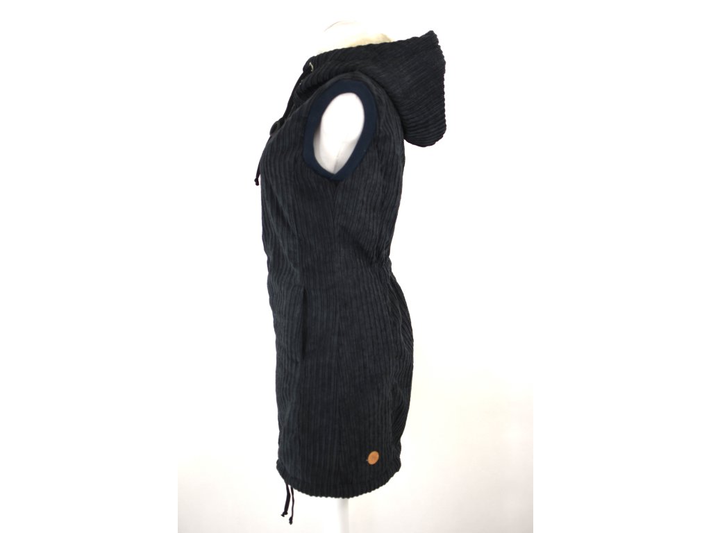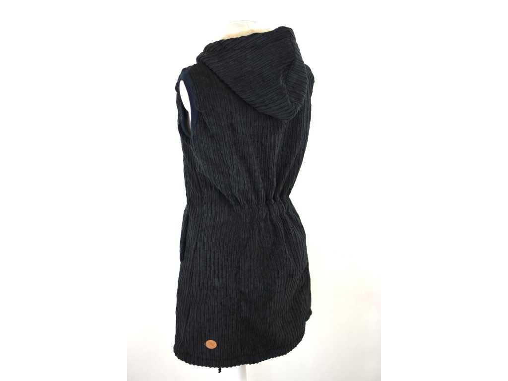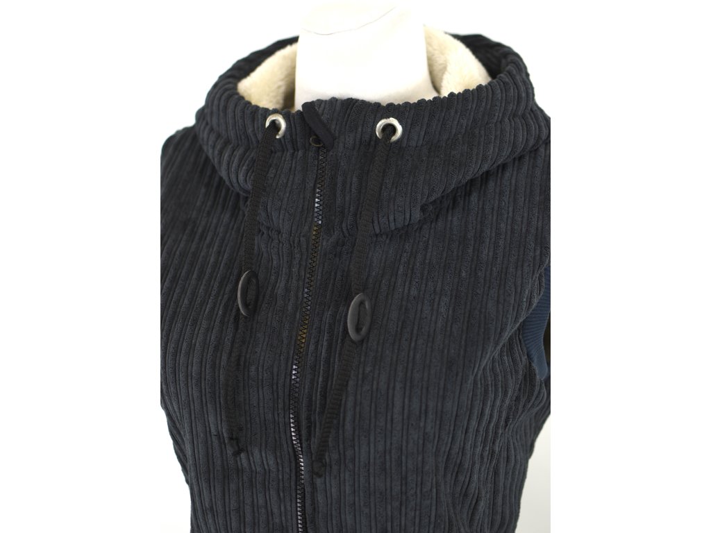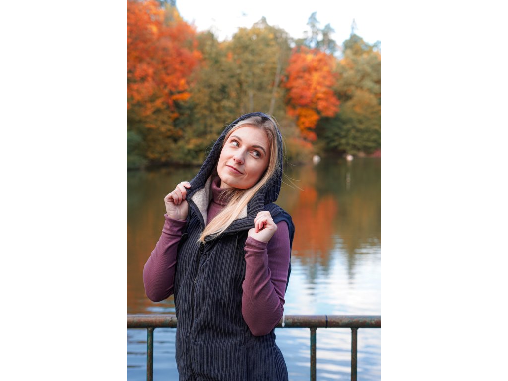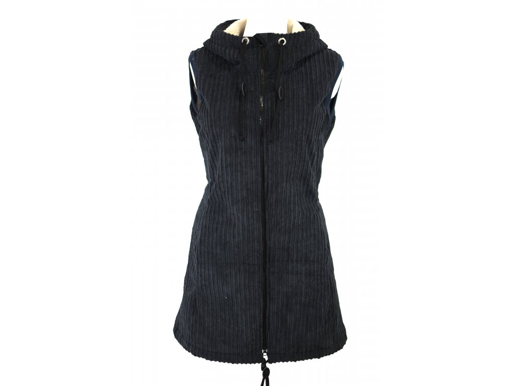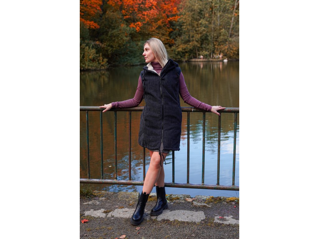 Dámská vesta mírně projmutá do pasu z manšestru, z rubu má teplý chloupek. Má velkou kapucu, stahování v dolním okraji a dvoucestný zip, u vrchní části s krytkou. Vesta má dvě kapsy v členícím švu, tyto švy zároveň slouží jako tvarovací. Členící švy i na zadním díle, projmutí v pase tvoří guma napevno všitá. Průramky jsou lemované nápletem - jsou flexibilní a vejde se tak do nich pohodlně jedna vrstva.